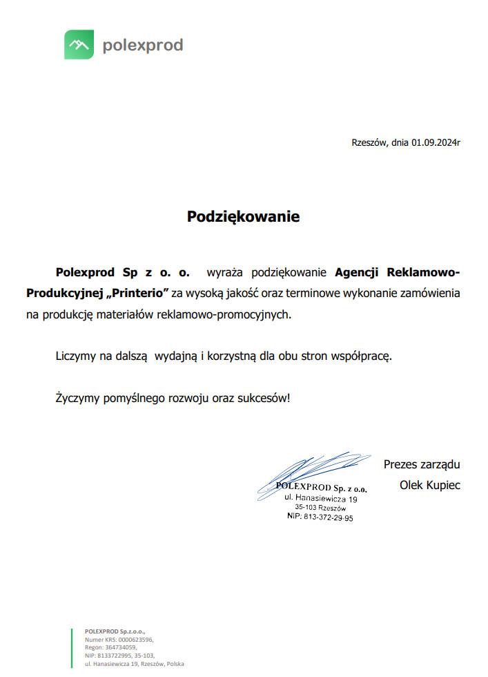 Polexprod Sp z o. o. wyraża podziękowanie Agencji ReklamowoProdukcyjnej „Printerio” za wysoką jakość oraz terminowe wykonanie zamówienia na produkcję materiałów reklamowo-promocyjnych.