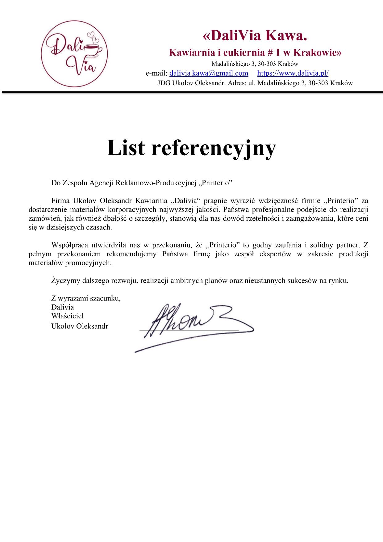 Firma Ukolov Oleksandr Kawiarnia "Dalivia" pragnie wyrazić wdzięczność firmie "Printeri" za dostarezenie materialów korporacyjnych najwyższej jakości. Państwa profesjonalne podejście do realizacji zamówień, jak również dbałość o szczegóły, stanowią dla nas dowód rzetelności i zaangażowania, które ceni się w dzisiejszych czasach.