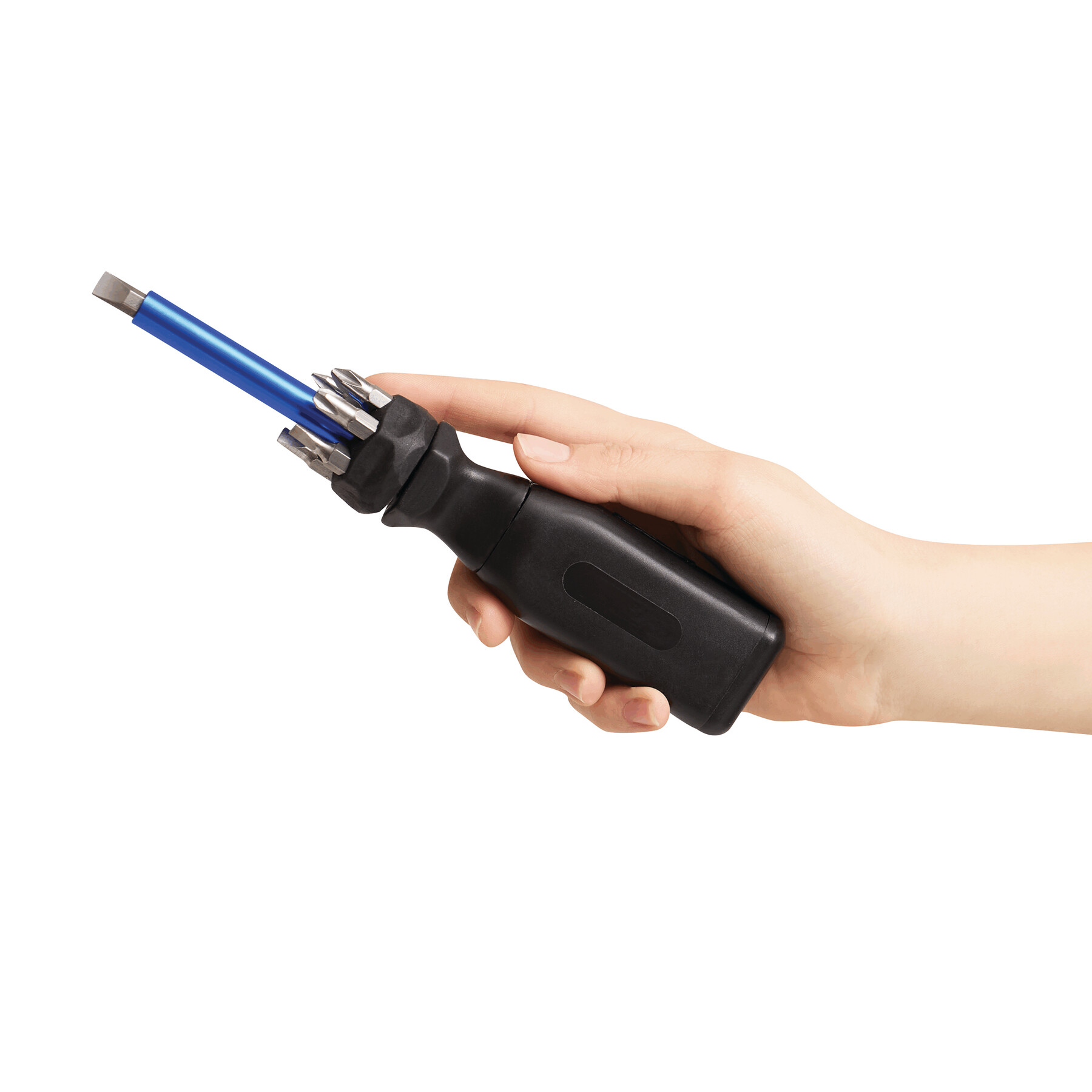 19-częściowy zestaw śrubokrętów SCREW FINDER z teleskopową końcówką z magnesem na nakładki umieszczone w rączce.