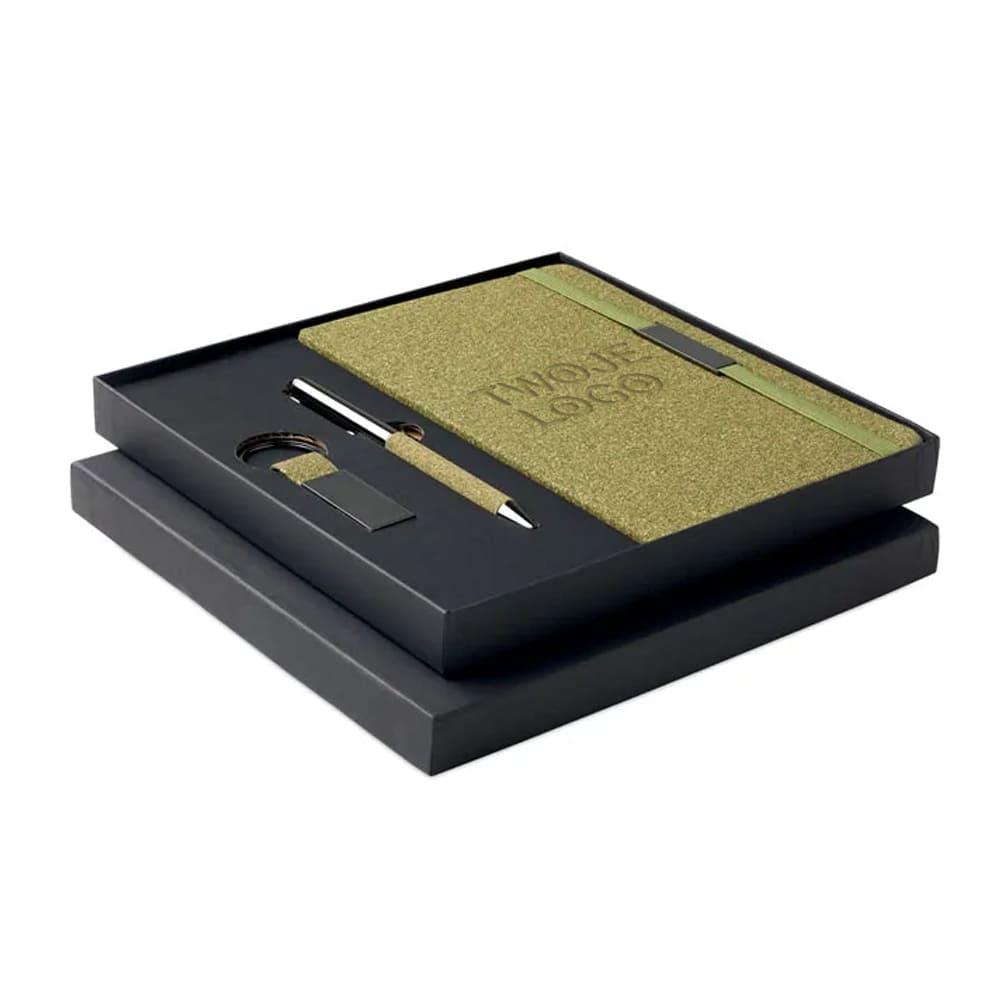 Zestaw składający się z notesu A5 w twardej okładce, 160 kartek w linie (80 kartek/70 g/m²), metalowego długopisu i breloka. Wykonany w 20% z fusów herbacianych, w 30% z korka i w 50% z tkaniny polycotton. Metalowy detal na elastycznym pasku. FSC®-certified | FSC MIX CREDIT, N7.1, FSC-C213206