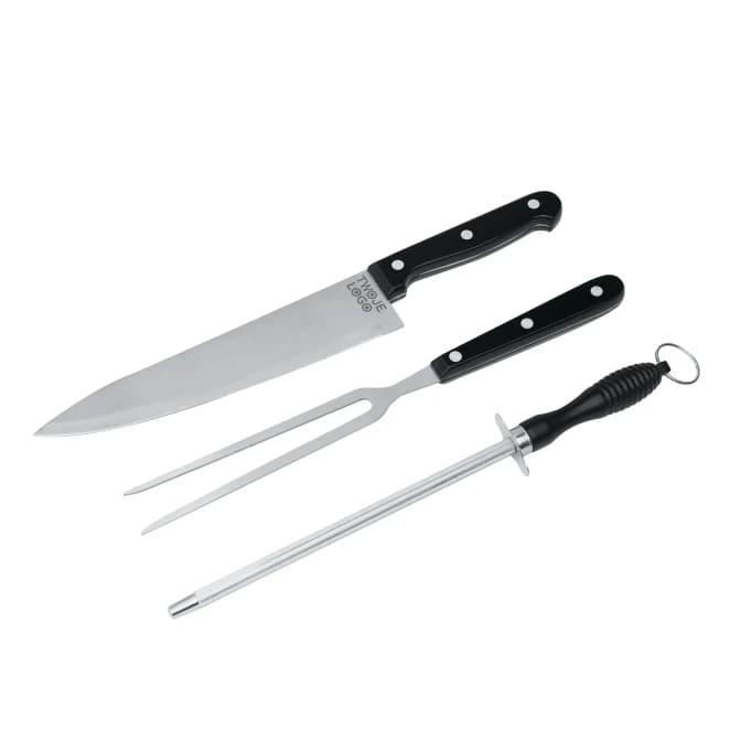 3-częściowy zestaw ze stali nierdzewnej CARVE składa się z ostrzałki z metalowym oczkiem do zawieszania, noża i widelca do mięsa, zapakowany w proste pudełko.