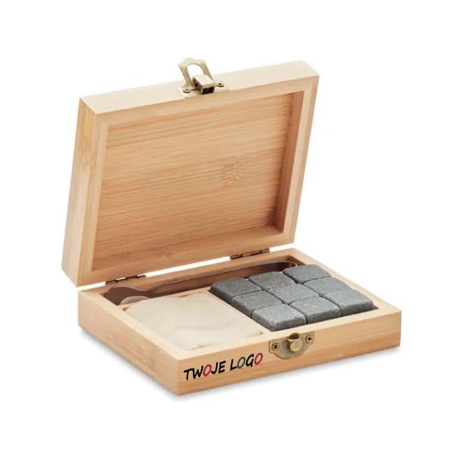 Zestaw do whisky w bambusowym pudełku. Zawiera kamienie wielokrotnego użytku, bawełnianą sakiewkę i szczypce. Bambus jest produktem naturalnym, dlatego mogą występować niewielkie różnice w kolorze i rozmiarze poszczególnych elementów, co może mieć wpływ na ostateczny efekt zdobienia.