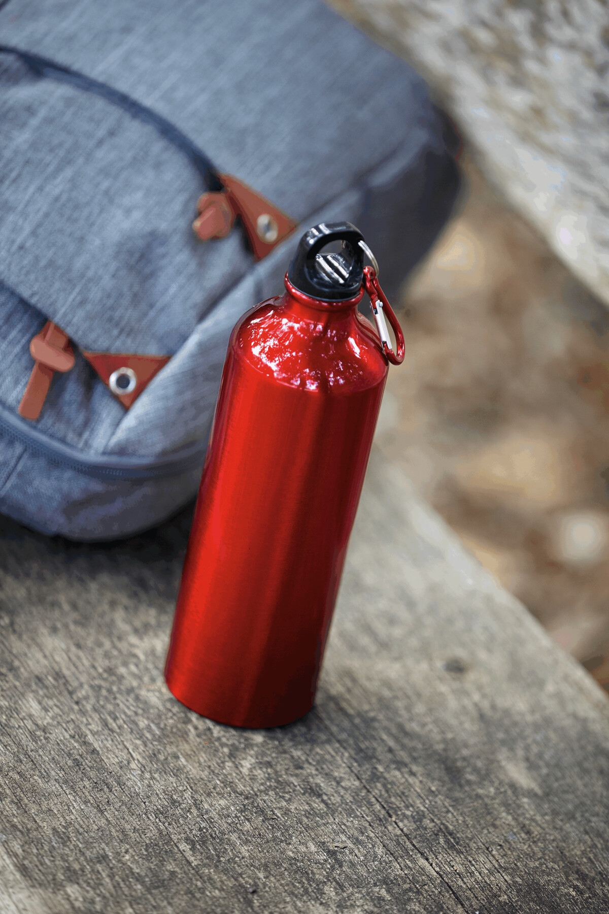 Aluminiowy bidon BIG TRANSIT z plastikową pokrywą z dopasowanym kolorystycznie karabińczykiem. Pojemność ok. 750 ml.