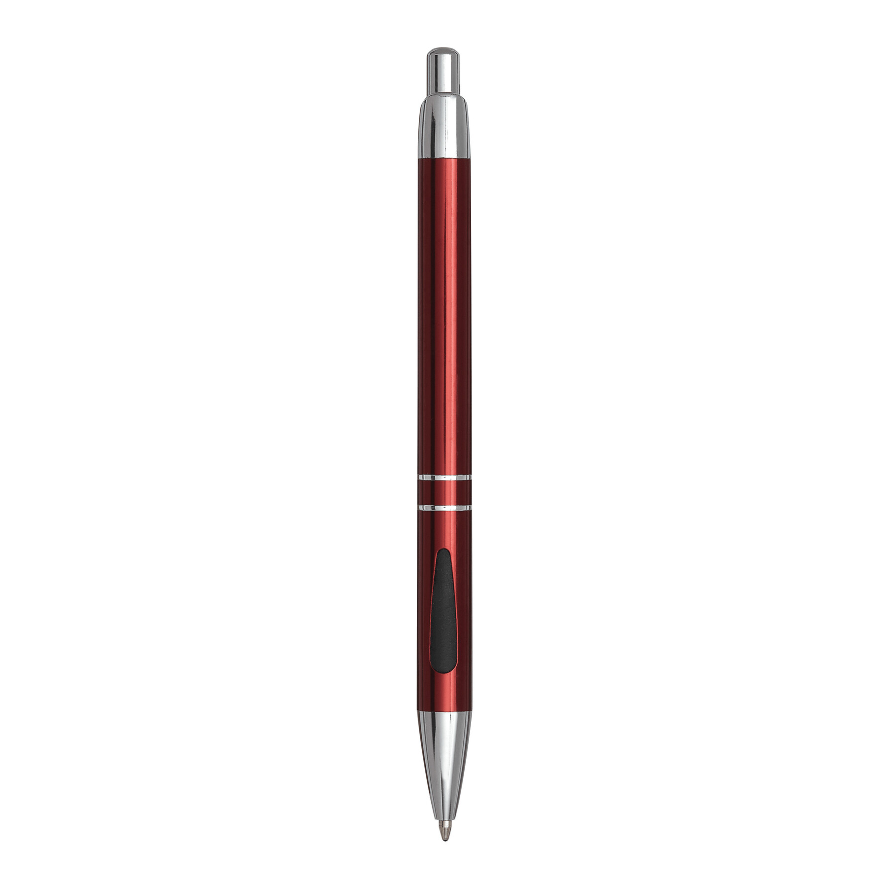 Aluminiowy długopis LUCERNE z lśniącą obsadką i częściowo pokrytym gumą uchwytem, mechanizm przyciskowy i duży wkład z czarnym tuszem.