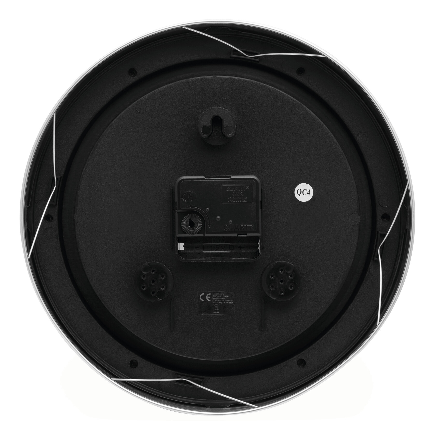 Aluminiowy zegar ścienny JUPITER z termometrem, higrometrem i szeroką ramą.