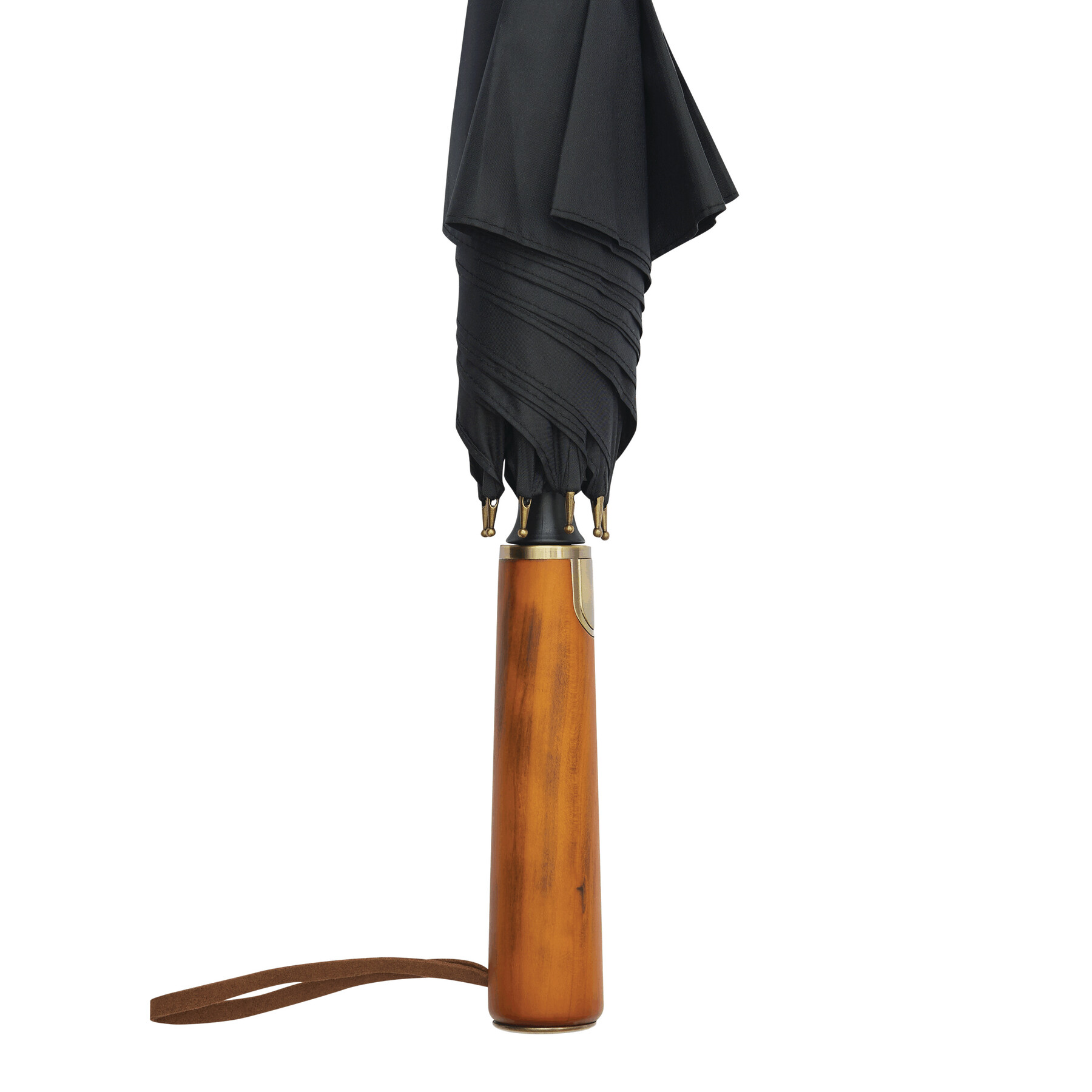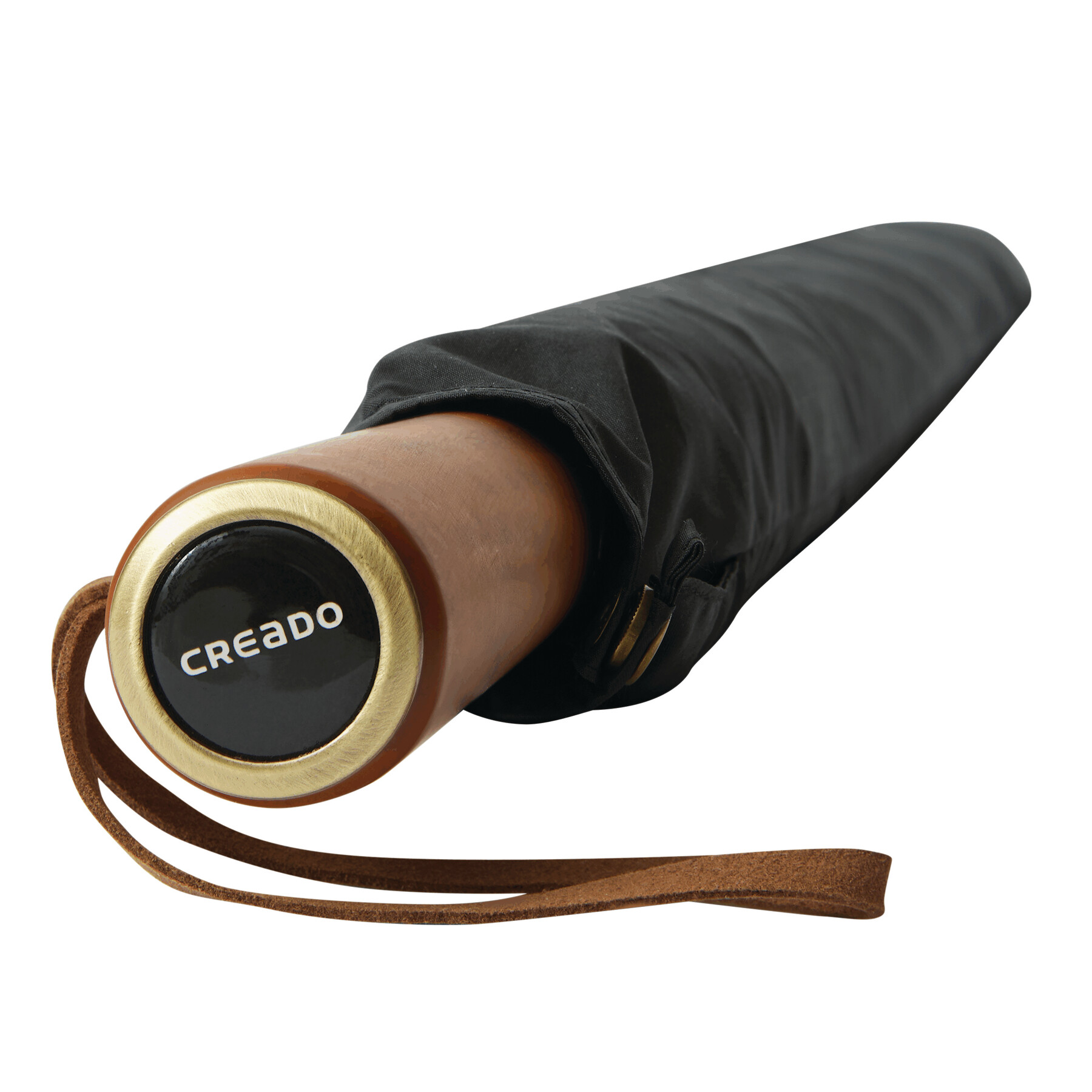 Automatyczny parasol POLKA z wysokiej jakości poszyciem i pokrowcem z poliestru pongee. Ma czarną metalową laskę, szyny z włókna szklanego i metalowe kolce. Posiada prosty, drewniany uchwyt z mosiężnym przyciskiem automatycznego otwierania i domingiem „CREADO”. Zapinany jest na pasek z zatrzaskiem.