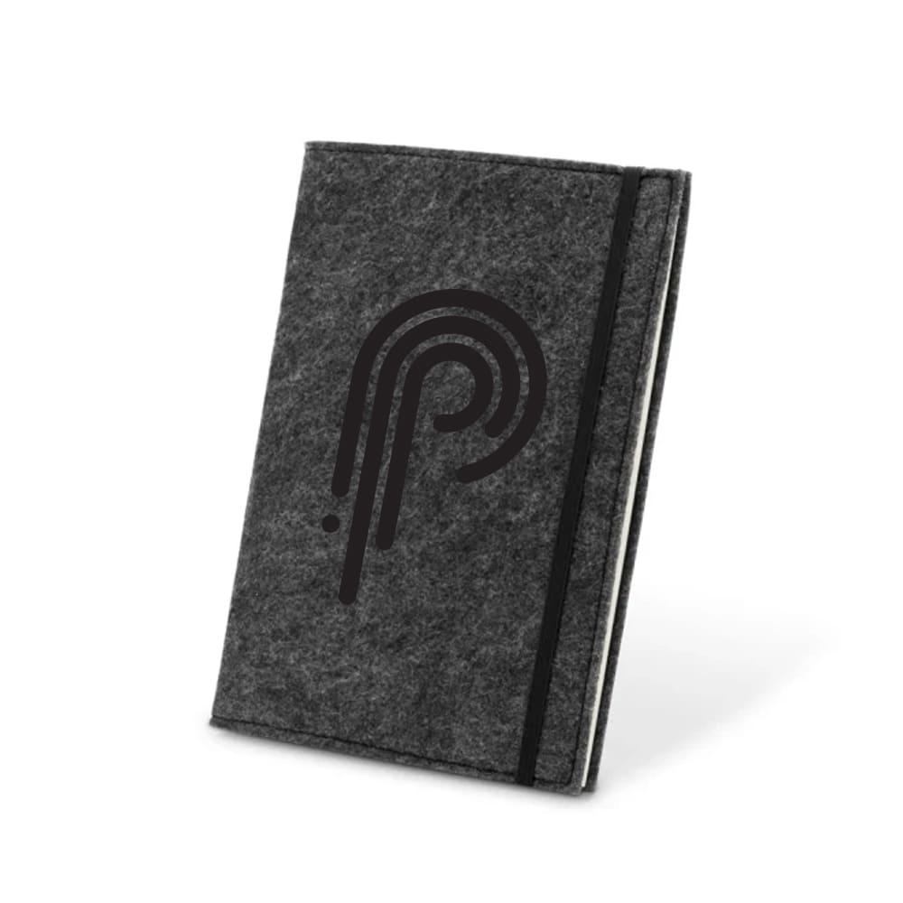 Okładka z filcu z recyklingu (100% rPET) z notatnikiem A5 w środku. Wyjmowany notatnik zawiera okładkę wykonaną w 100% z papieru pochodzącego z recyklingu, a także 160 liniowanych stron w kolorze kości słoniowej, również wykonanych w 100% z papieru pochodzącego z recyklingu. 150 x 210 mm