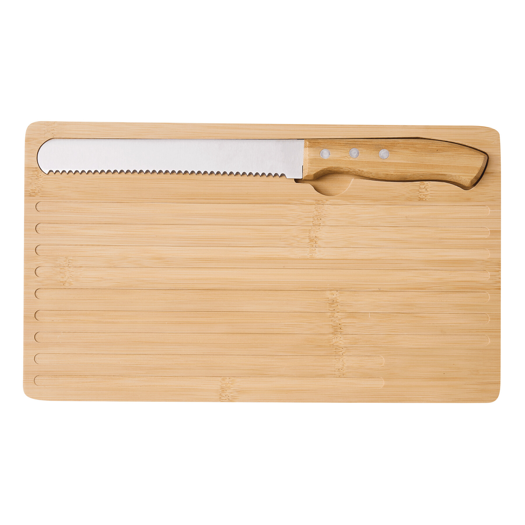 Bambusowa deska do krojenia CRUMBS W zestawie zawiera nóż do chleba z ostrzem ze stali nierdzewnej i bambusową rączką. Nóż idealnie mieści się we wgłębieniu.