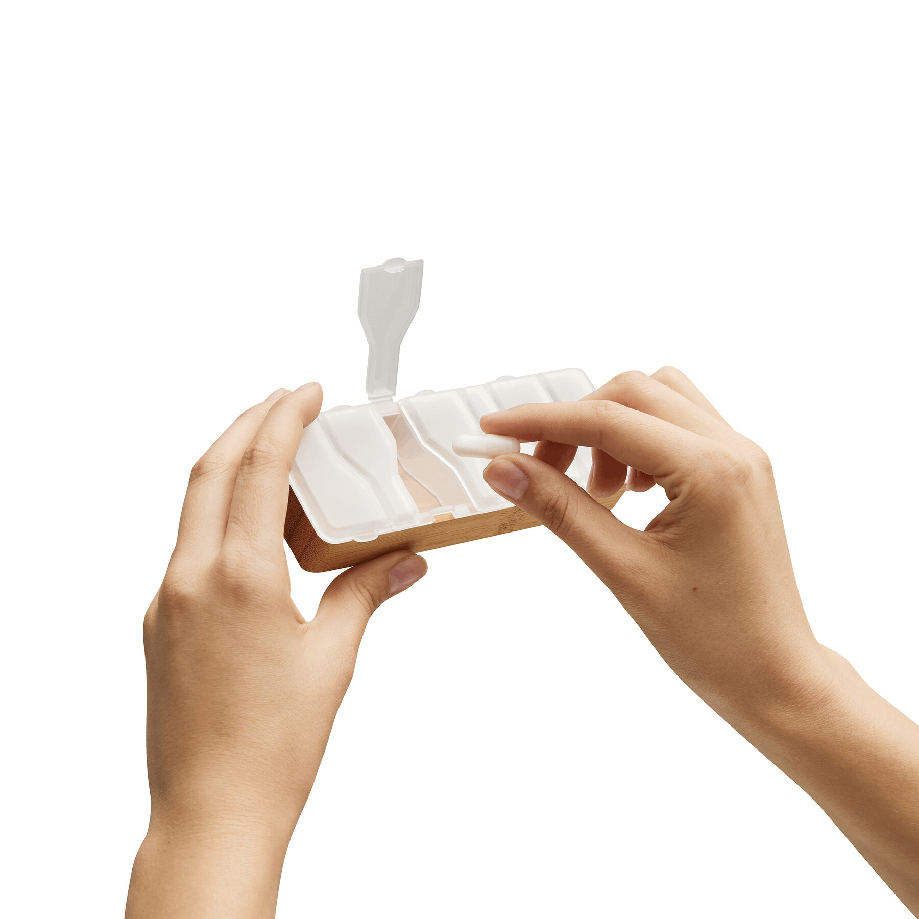 Bambusowe pudełko na tabletki SORTED. Zawiera 7 oddzielnych przegródek. Pozwala na precyzyjne dozowanie leków przez cały tydzień.