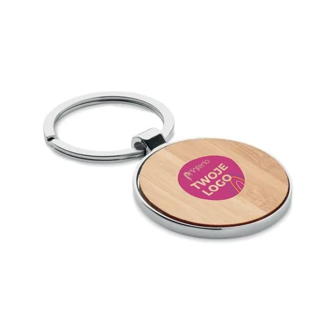 Okrągły brelok ze stopu cynku oraz z bambusem. Bambus jest produktem naturalnym, mogą występować niewielkie różnice w kolorze i rozmiarze.