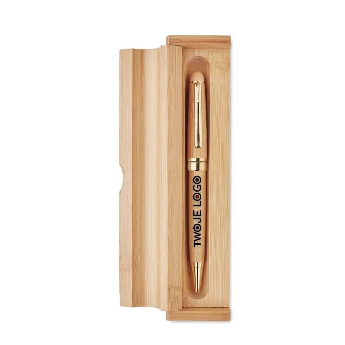 Zestaw upominkowy z obrotowym długopisem w bambusowym pudełku. Niebieski atrament. Bambus jest produktem naturalnym, mogą występować niewielkie różnice w kolorze i rozmiarze.