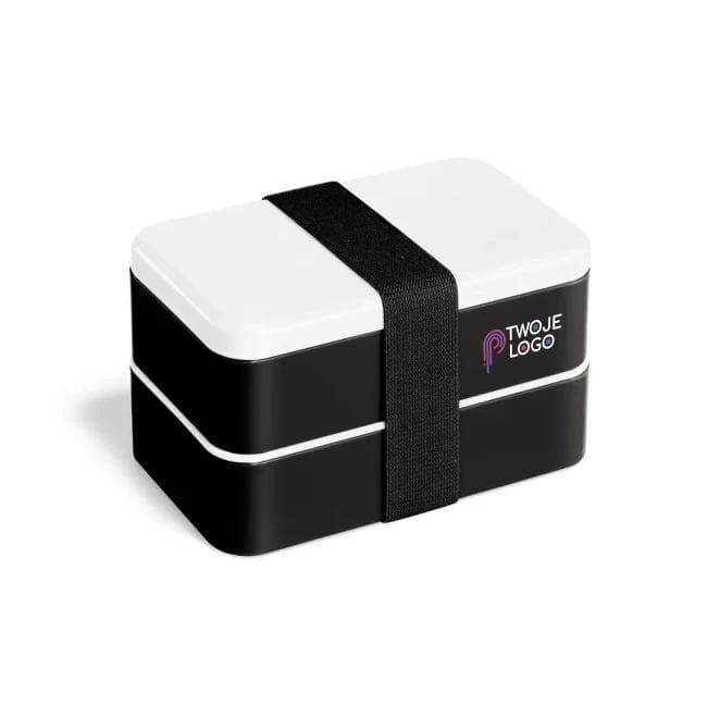 Pojemnik na lunch z PP i PS z 2 komorami (każda o pojemności 680 mL) i 1 wyjmowaną przegrodą. Zawiera 3 sztućce: widelec, nóż i łyżkę. Zamykany na gumkę, nadaje się do mikrofalówki (zdjąć pokrywkę). 180 x 100 x 100 mm