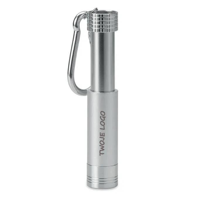 Mini brelok LED z aluminium i ABS. Zawiera 4 baterie LR44.