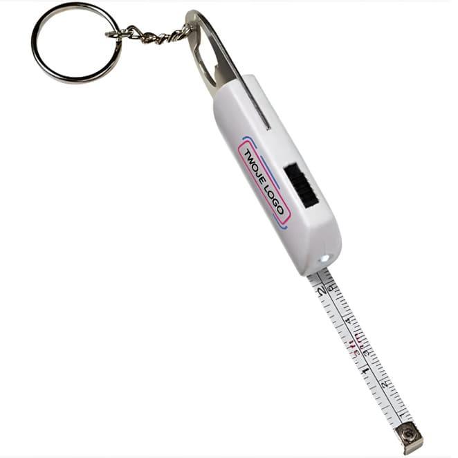 Brelok do kluczy, lampka LED, otwieracz do butelek, miara 1m do nałożenia logo