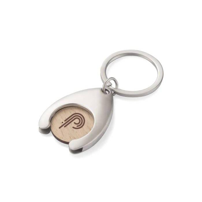 Brelok metalowy wraz z żetonem wykonanym z drewna mebli po recyklingu. Żeton pasuje do wózków sklepowych. Zapakowany w brązową kopertę.