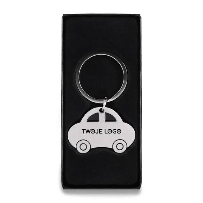 Brelok metalowy w kształcie autka. Pakowany w czarne kartonowe opakowanie upominkowe.