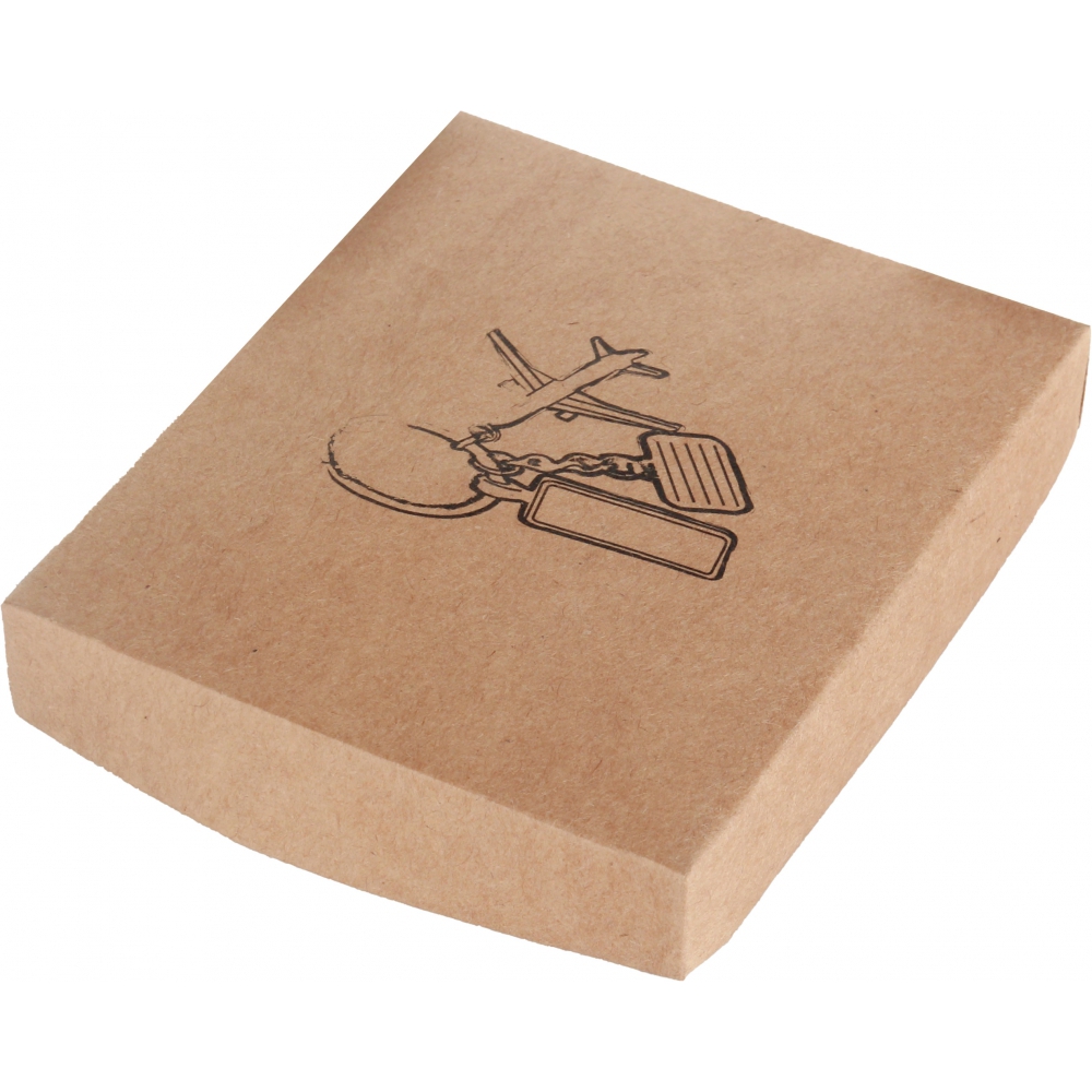 Metalowy brelok z zawieszkami oraz metalową blaszką, na której można umieścić logotyp.