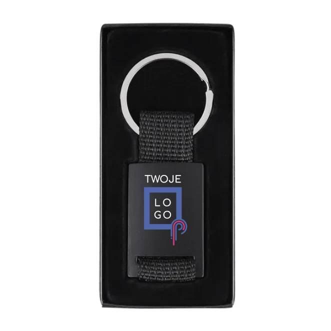 Elegancki brelok o czarnej matowej powierzchni. Wykonany z metalu i poliestru. Pakowany w czarne pudełko upominkowe.