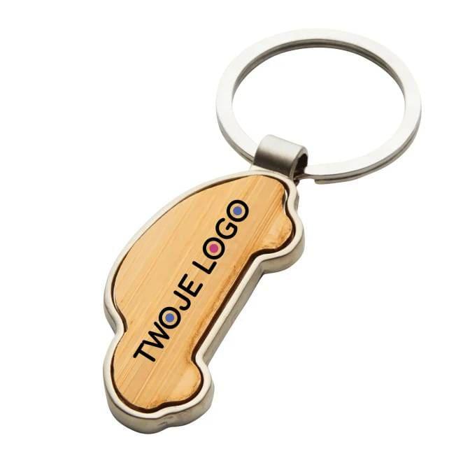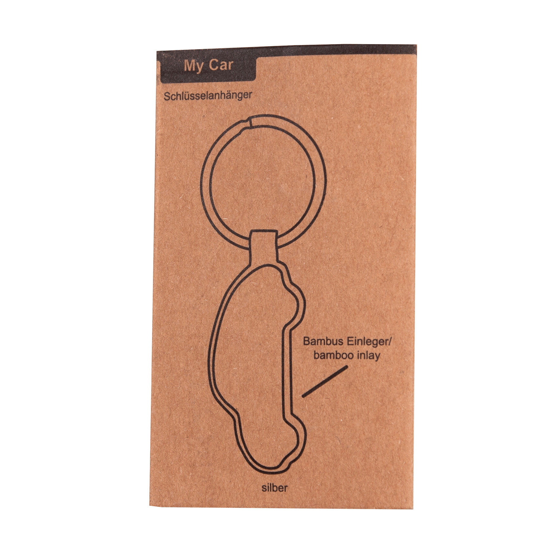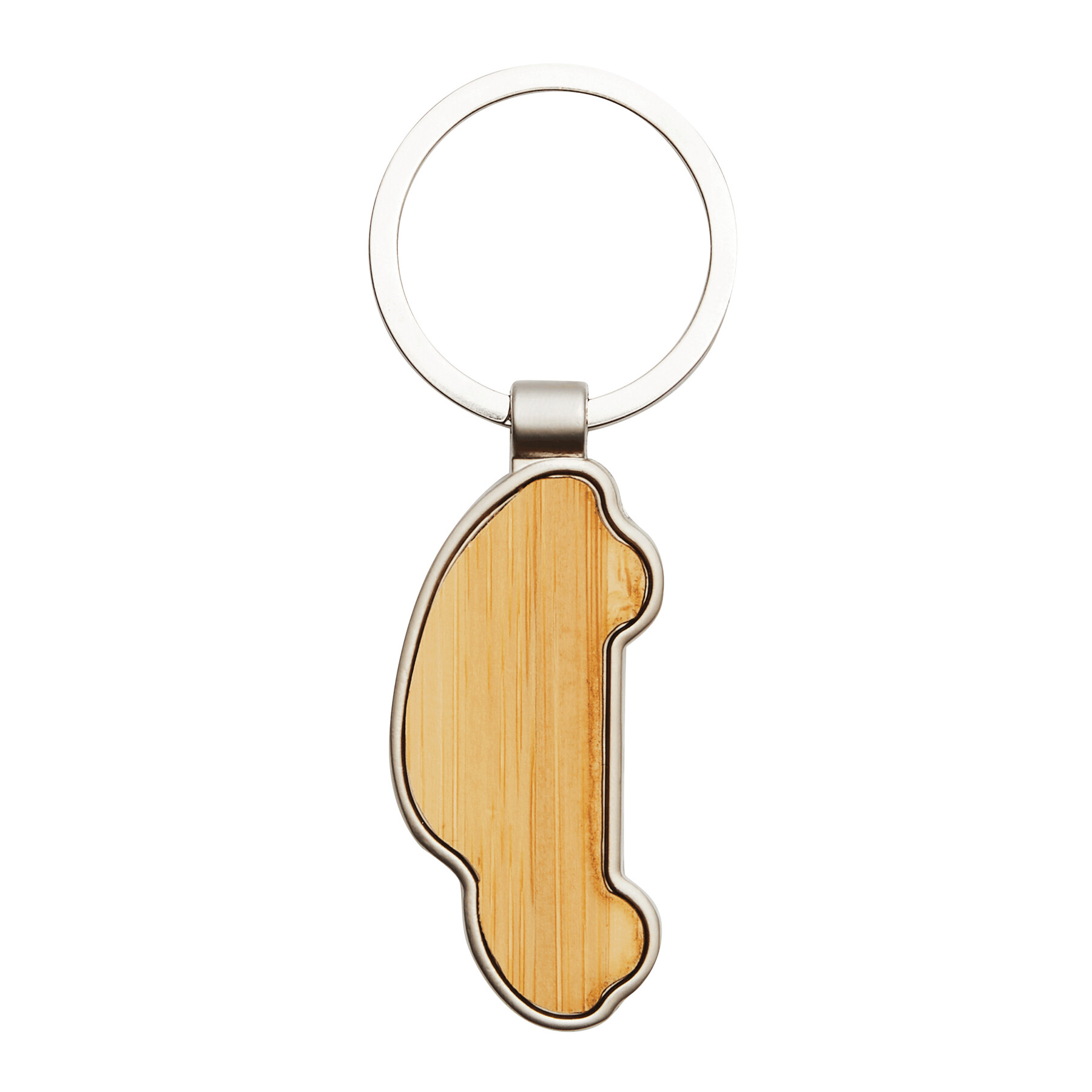 Brelok MY CAR. Metalowa zawieszka w kształcie samochodu z bambusowym wykończeniem.