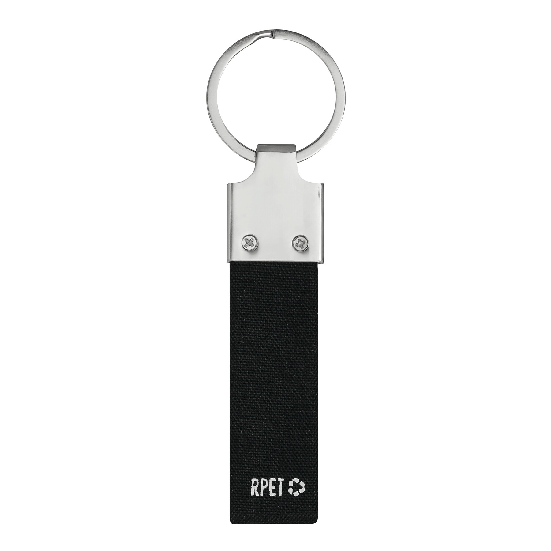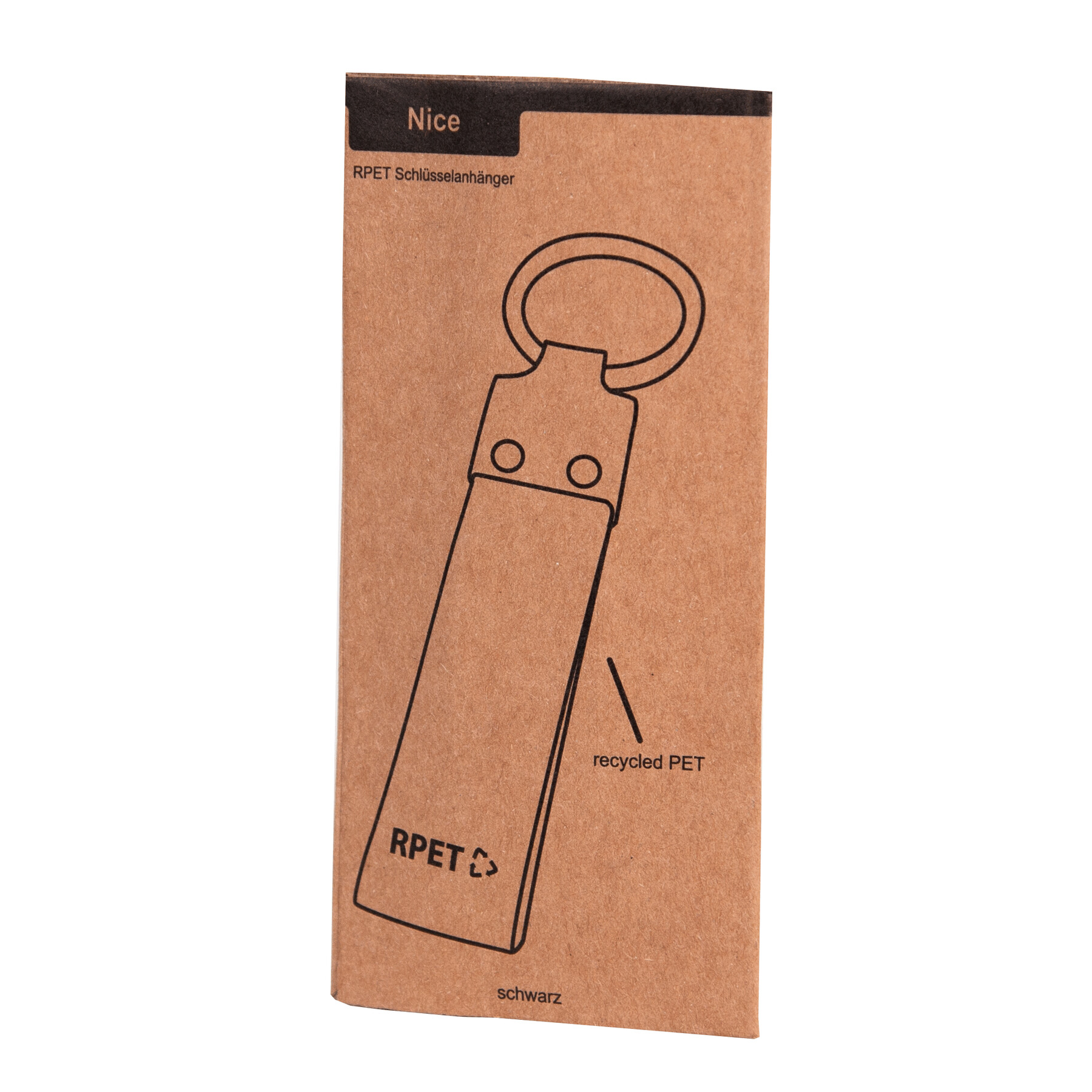 Brelok NICE. Wykonany jest z materiałów pochodzących z recyklingu. Posiada metalowe kółko na klucze.