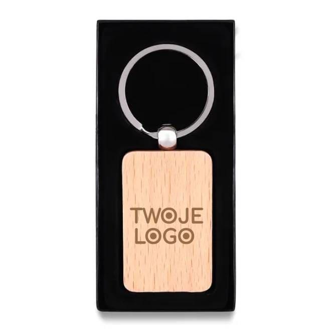 Drewniany brelok pakowany w czarne pudełko upominkowe.