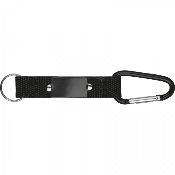 Metalowy brelok do kluczy z karabińczykiem na poliestrowej taśmie.