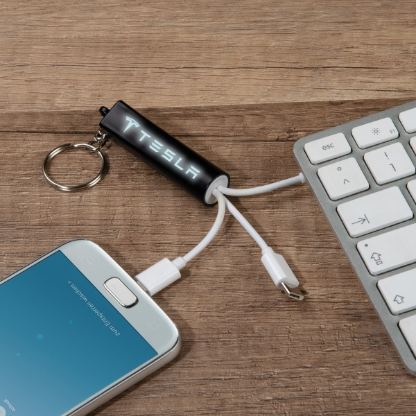 Plastikowy brelok z 3 przejściówkami do ładowania urządzeń z systemem Android i iOS oraz portem USB. Grawerowane logo świeci podczas ładowania.