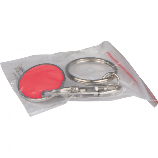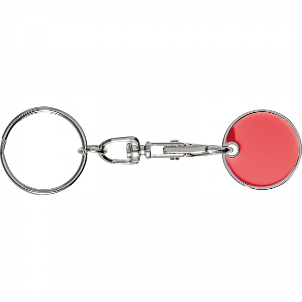 Metalowy brelok z karabińczykiem i żetonem do wózka na zakupy.