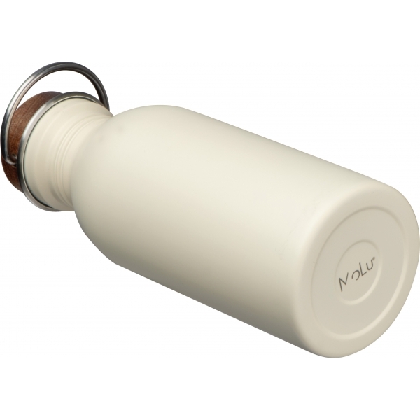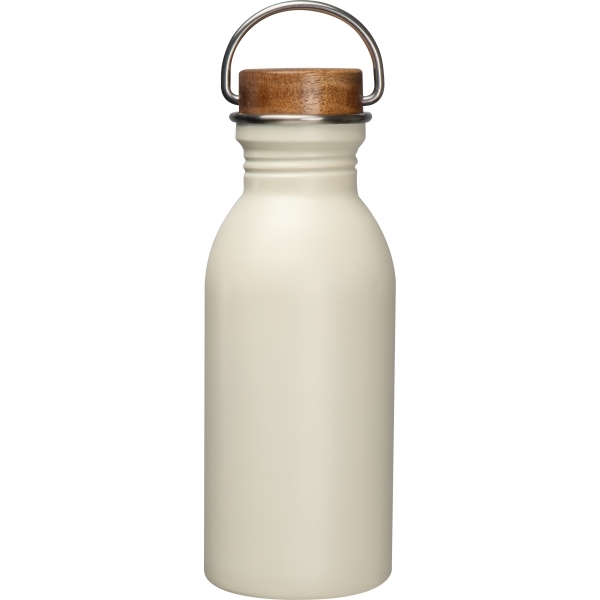 Butelka do picia, wykonana ze stali nierdzewnej z recyklingu, zamykana na zakrętkę z drewna akacjowego, wyposażona w uchwyt do przenoszenia. Pojemność 500 ml.