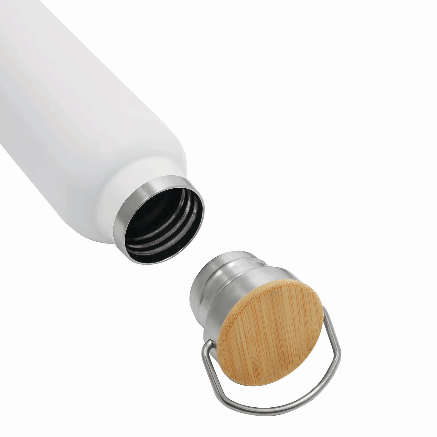 Butelka próżniowa do picia ECO FLAVOUR, dwuścienna: wewnątrz i na zewnątrz ze stali nierdzewnej, bezpieczna zakrętka z bambusa z silikonową uszczelką i pętlą do noszenia, pojemność ok. 500 ml, utrzymuje ciepło do 8 godzin i zimno do 12 godzin.
