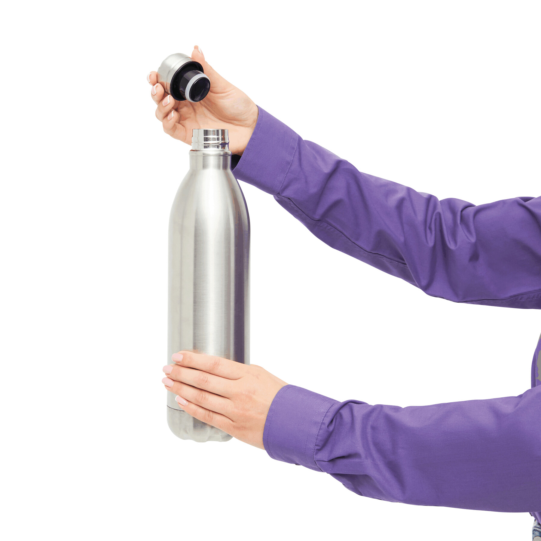Butelka próżniowa JUMBO TASTE dwuścienna: na zewnątrz i wewnątrz wykonana ze stali nierdzewnej, srebrna zakrętka ze szczelnym gwintem, pojemność: ok. 1000 ml, utrzymuje ciepło napoju przez ok. 8 godzin i zimno do 12 godzin.