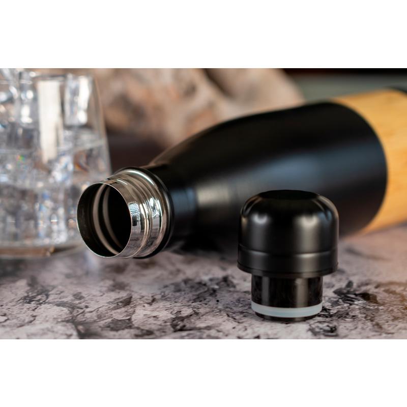 Butelka wykonana ze stali nierdzewnej z bambusowym elementem. Butelka posiada szczelne zamknięcie, dzięki czemu nie przecieka. Pojemność butelki to 750 ml.