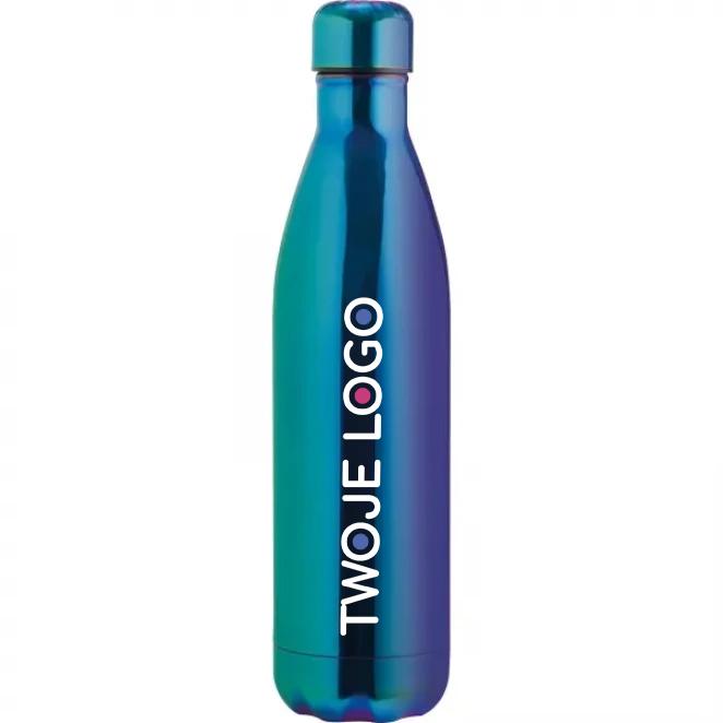 Szczelna butelka próżniowa ze stali nierdzewnej. Pojemność 800 ml. W świetle butelka mieni się tęczowymi kolorami.