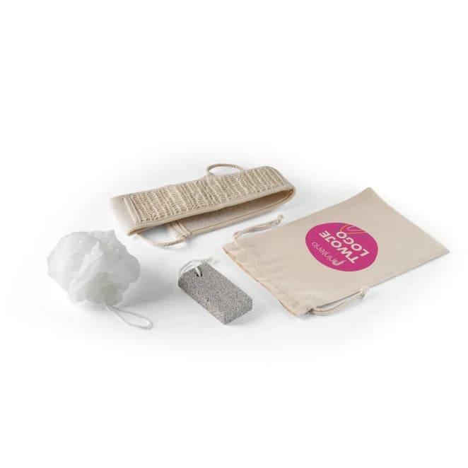Zestaw SPA zawierający: PET (80% rPET) + PET pufa do kąpieli z poliestrowym uchwytem, kamień pommes z poliestrowym sznurkiem oraz bawełniany i jutowy ręcznik do pleców złuszczający, z bawełnianymi uchwytami. Produkty KIT dostarczane oddzielnie, jeśli nie są spersonalizowane. Ponieważ produkt jest wykonany z naturalnych materiałów, kolor produktu oraz wynik drukowania mogą się różnić w zależności od produktu. Myjka pod prysznic: Ø100 mm | Ręcznik: 690 x 80 mm | Pumex: 100 x 50 x 20 mm | Torba: 280 x 200 mm