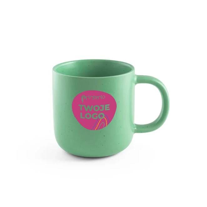 Kubek ceramiczny z matowym wykończeniem i nakrapianą powierzchnią kubka. Pojemność do 370 mL. Dostarczany w pudełku upominkowym z papieru kraft. Kubek nadaje się do mycia w zmywarce i jest odporny na co najmniej 125 cykli mycia (w tym nadruk) zgodnie z normą EN12875-1. ø85 x 85 mm