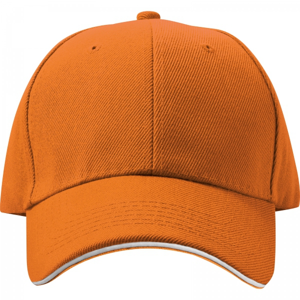 Bawełniana, 6-panelowa czapka z daszkiem typu Sandwich, wykonana z bawełny czesanej wolnej od AZO (gramatura 260 g/m²), regulowana za pomocą metalowego zapięcia.