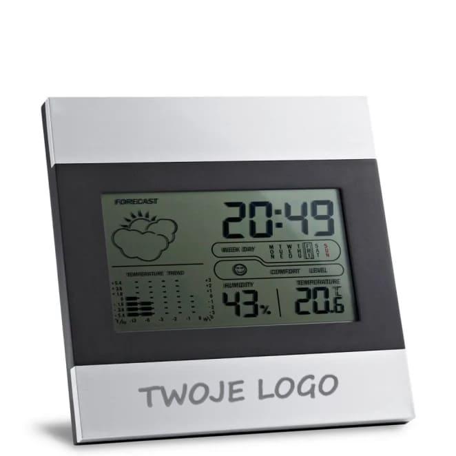 Stacja pogodowa na biurko z ekranem LCD z aluminium i ABS. Zawiera funkcje zegara, alarmu, kalendarza, termometru i pomiaru wilgotności. Zawiera 2 baterie AAA. Dostarczana w białym pudełku. 130 x 130 x 19 mm