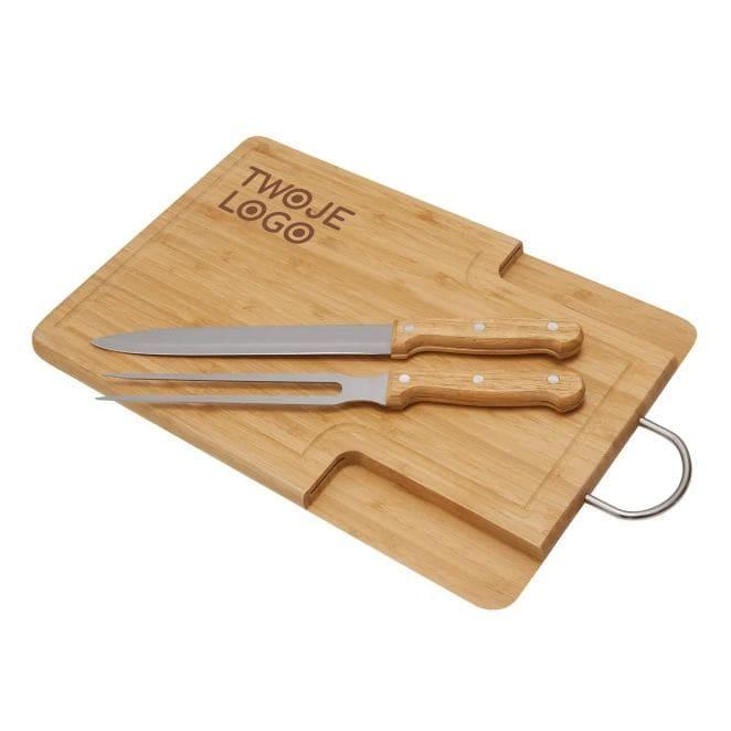 Deska do krojenia BAMBOO-CUT z widelcem i nożem ze stali nierdzewnej z drewnianymi uchwytami . Sztućce można bezpiecznie przechowywać wsunięte w specjalne nacięcia. Deska wykonana z bambusa, z praktycznym metalowym uchwytem do zawieszenia.