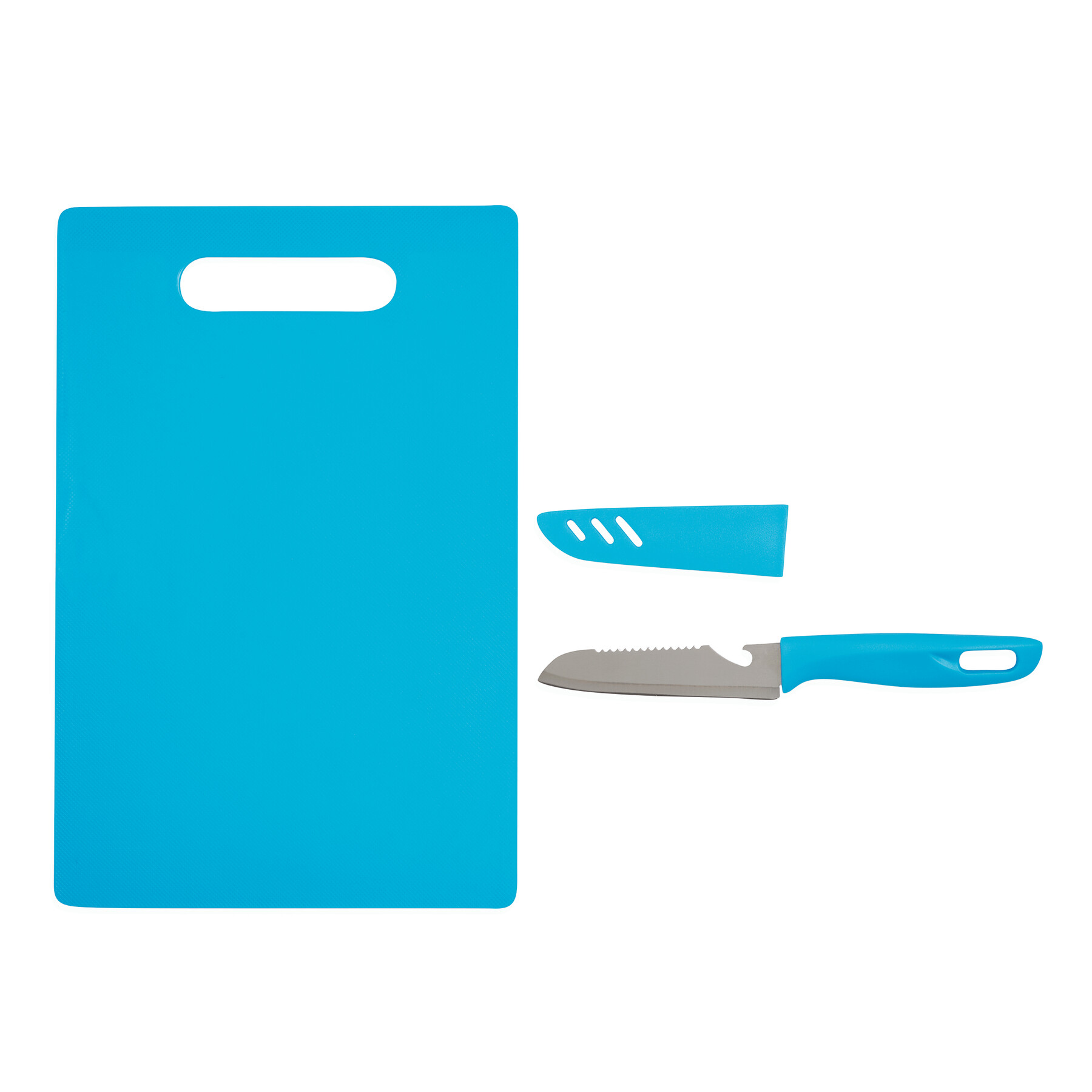Deska do krojenia SUNNY zawiera nóż z ostrzem ze stali nierdzewnej z otwieraczem do butelek i oczkiem do zawieszania w uchwycie. Osłona na ostrze, deska łatwa do zawieszenia.