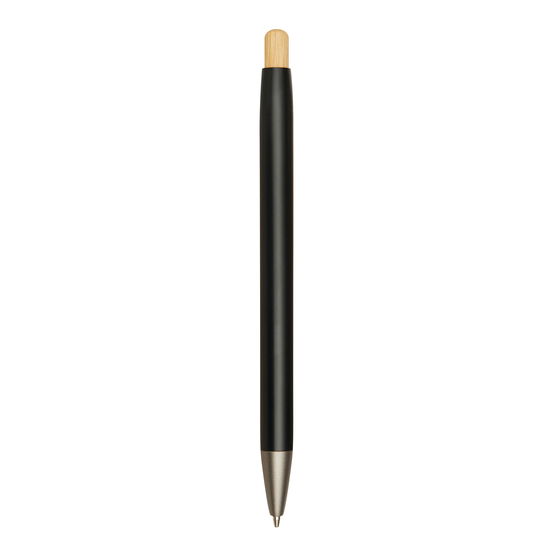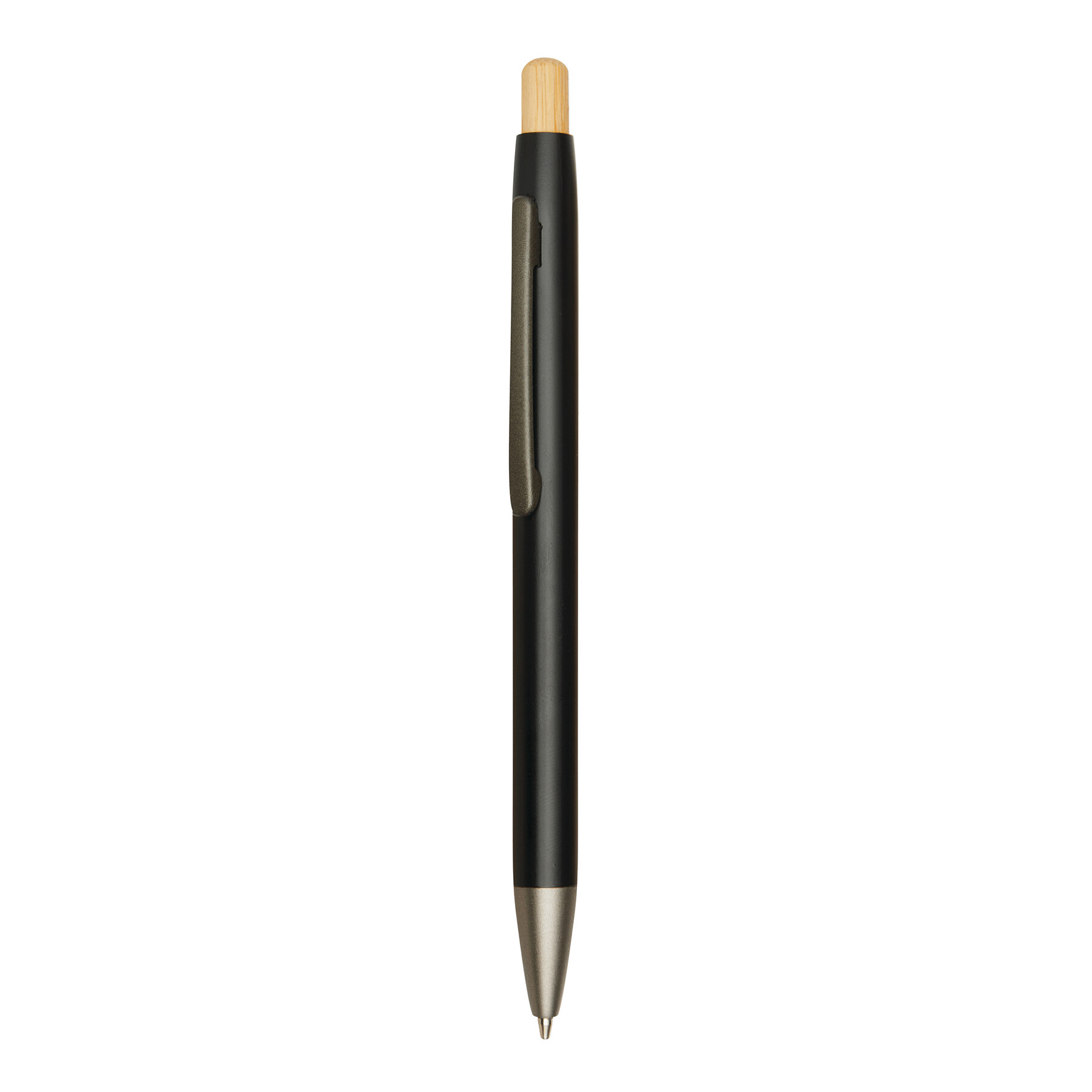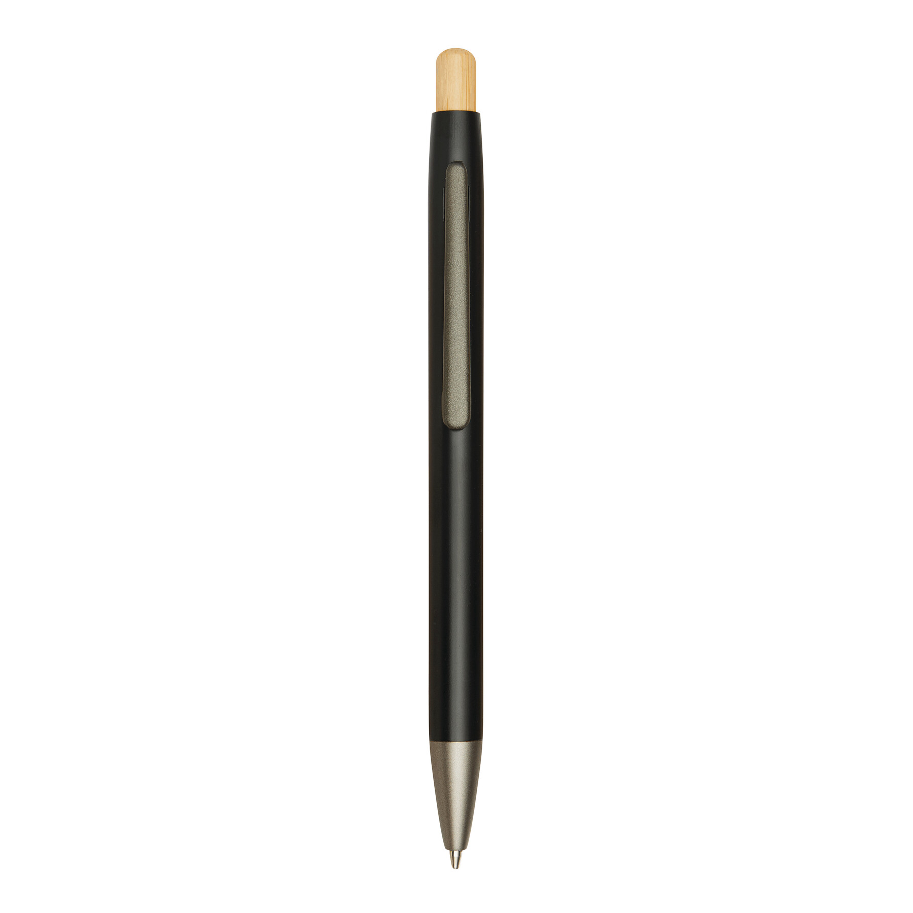 Długopis aluminiowy BAMBOO PUSHER z matowym metalowym korpusem wykonanym z aluminium pochodzącego z recyklingu. Posiada mechanizm naciskowy z bambusowym przyciskem i niebieski tusz.
