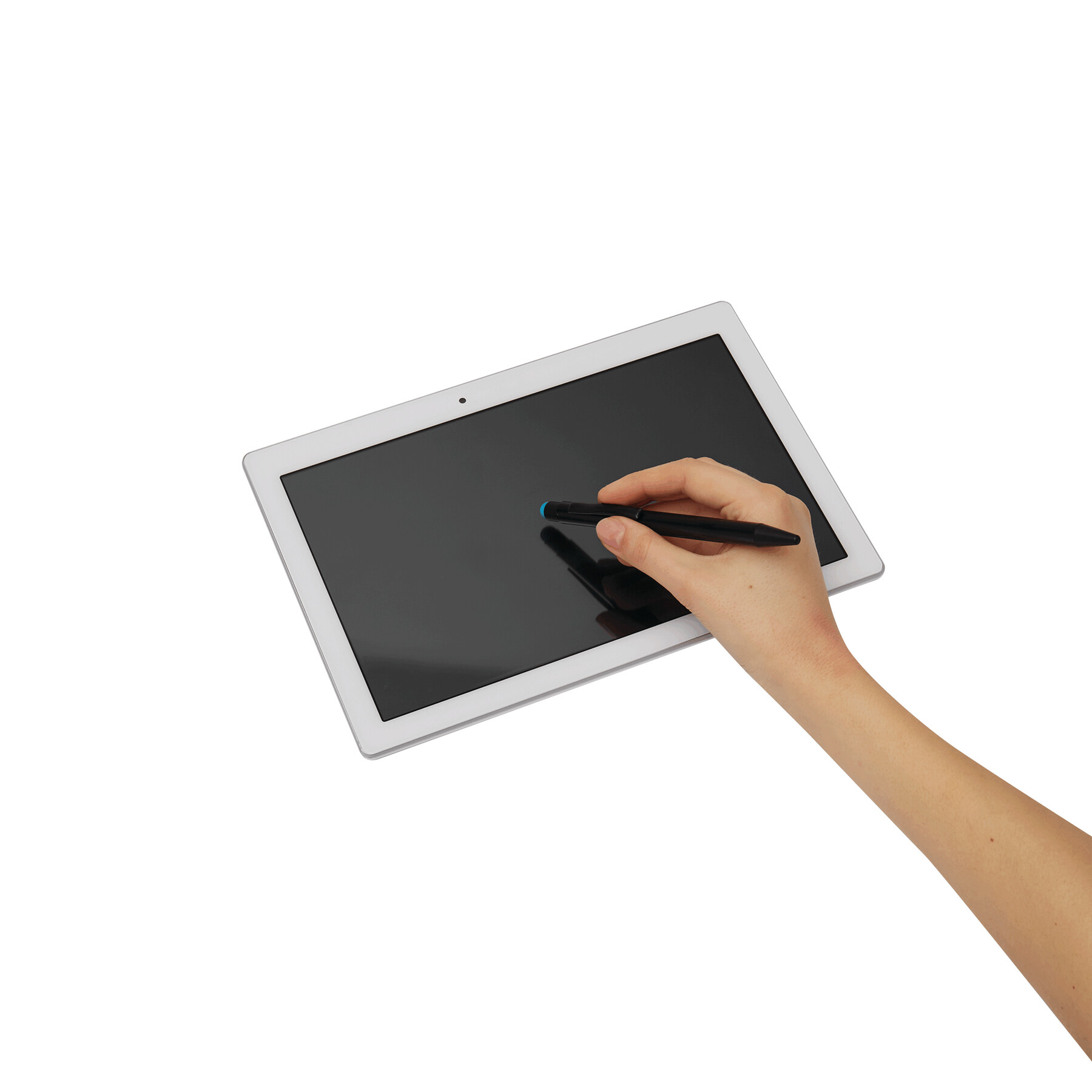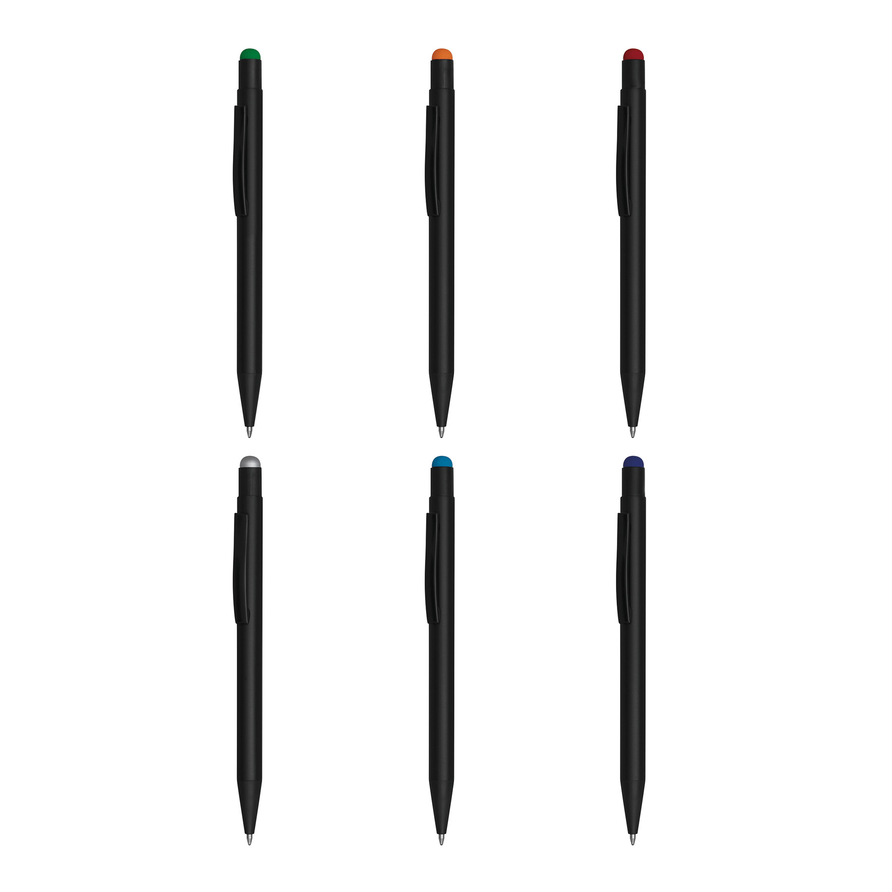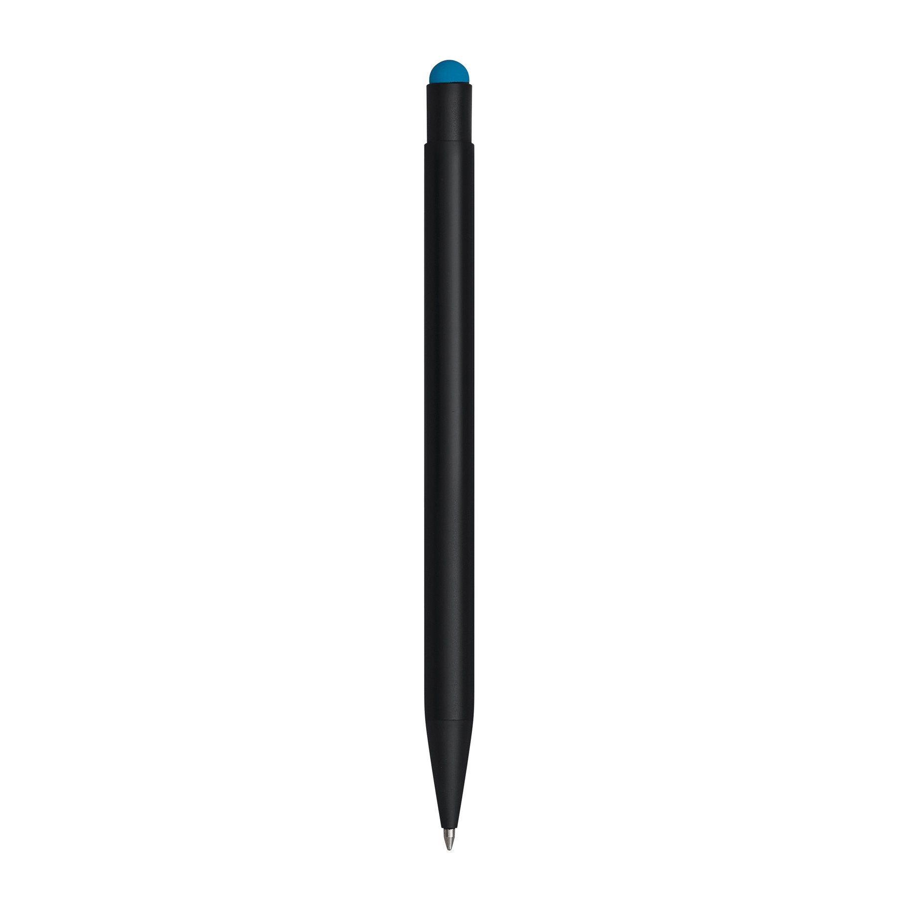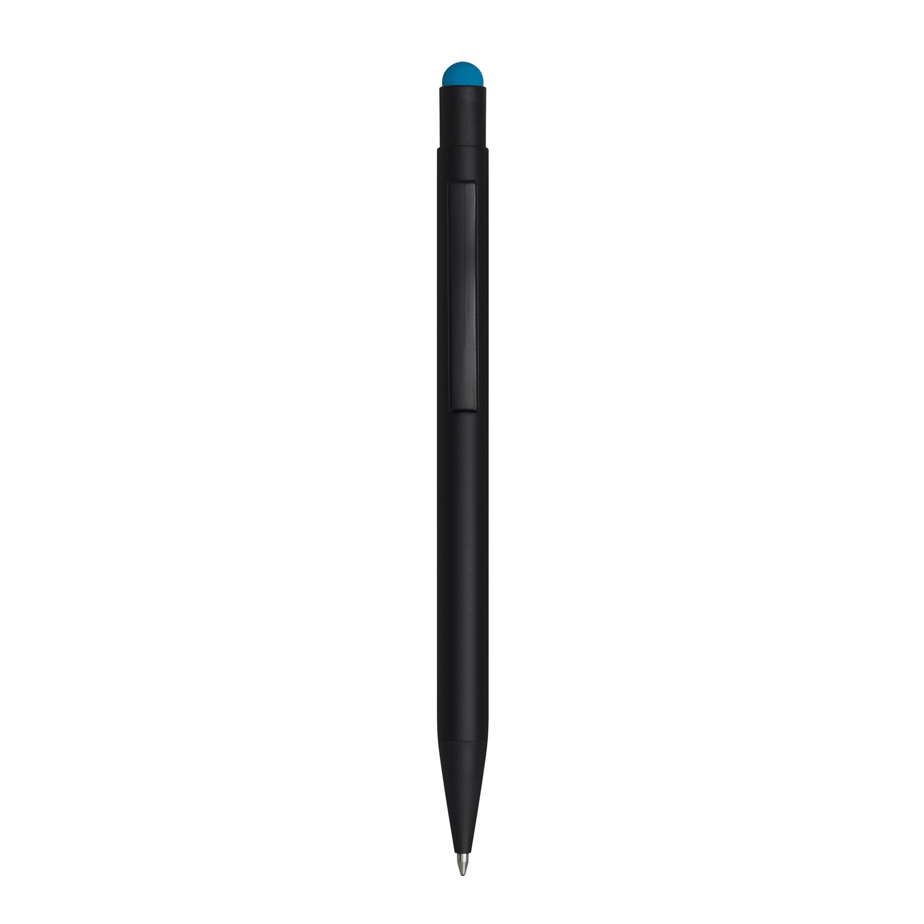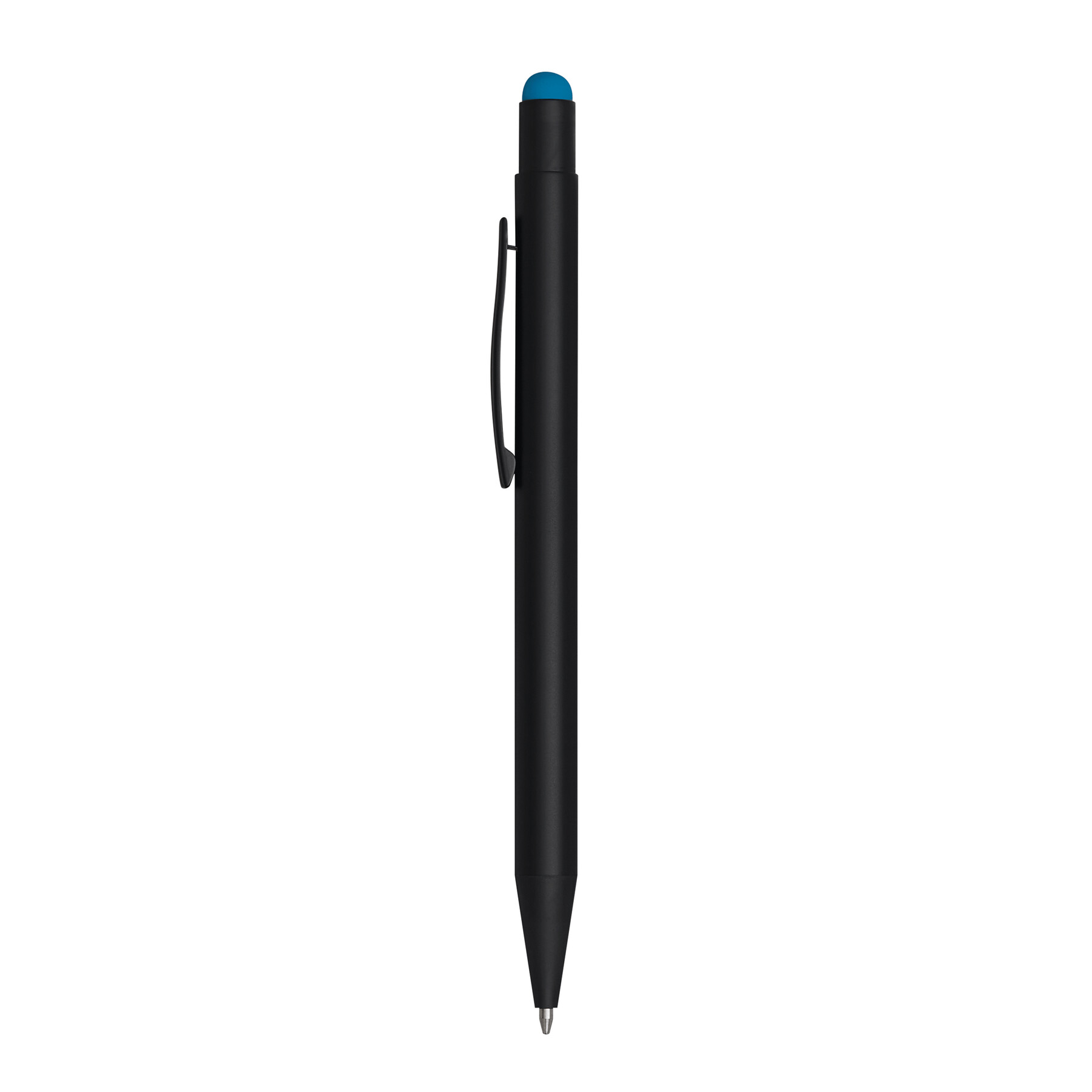 Długopis aluminiowy BLACK BEAUTY z końcówką do ekranów dotykowych, powierzchnia matowa, grawer prezentuje błyszczącą powierzchnię odpowiadającą kolorowi gumowanej końcówki długopisu, niebieski, duży wkład.
