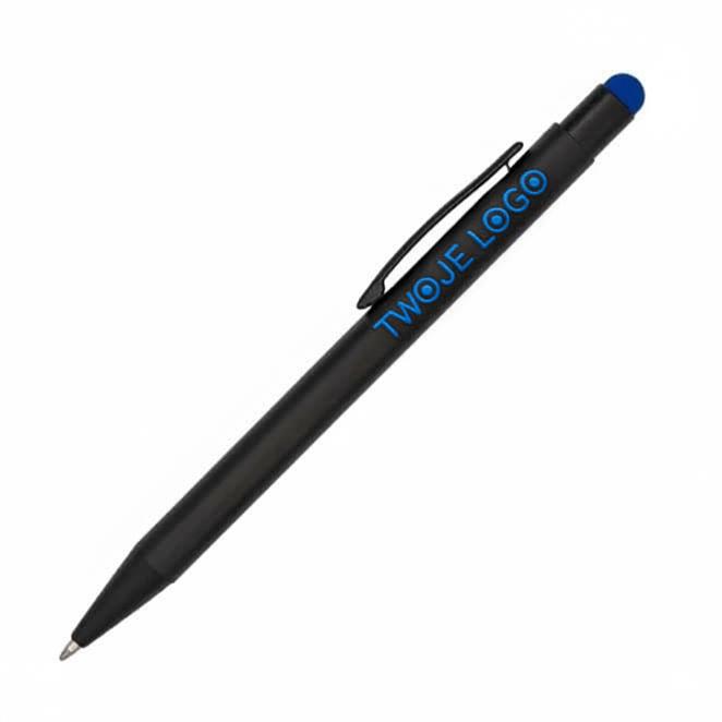 Długopis z czarnym korpusem i kolorową końcówką do ekranów dotykowych. Możliwość wykonana błyszczącego logo w kolorze nawiązującym do koloru końcówki. Niebieski wkład.