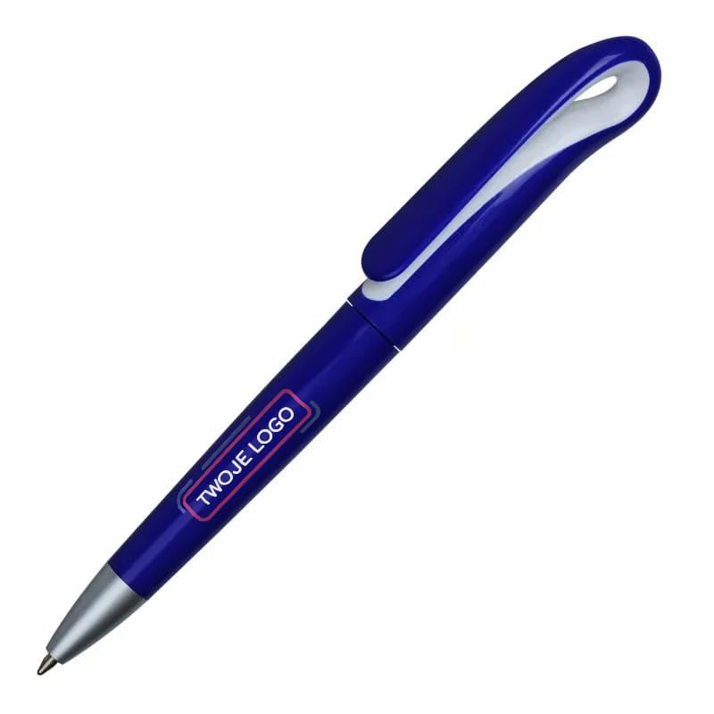 Plastikowy długopis o oryginalnym kształcie klipa. Wyposażony w niebieski wkład.