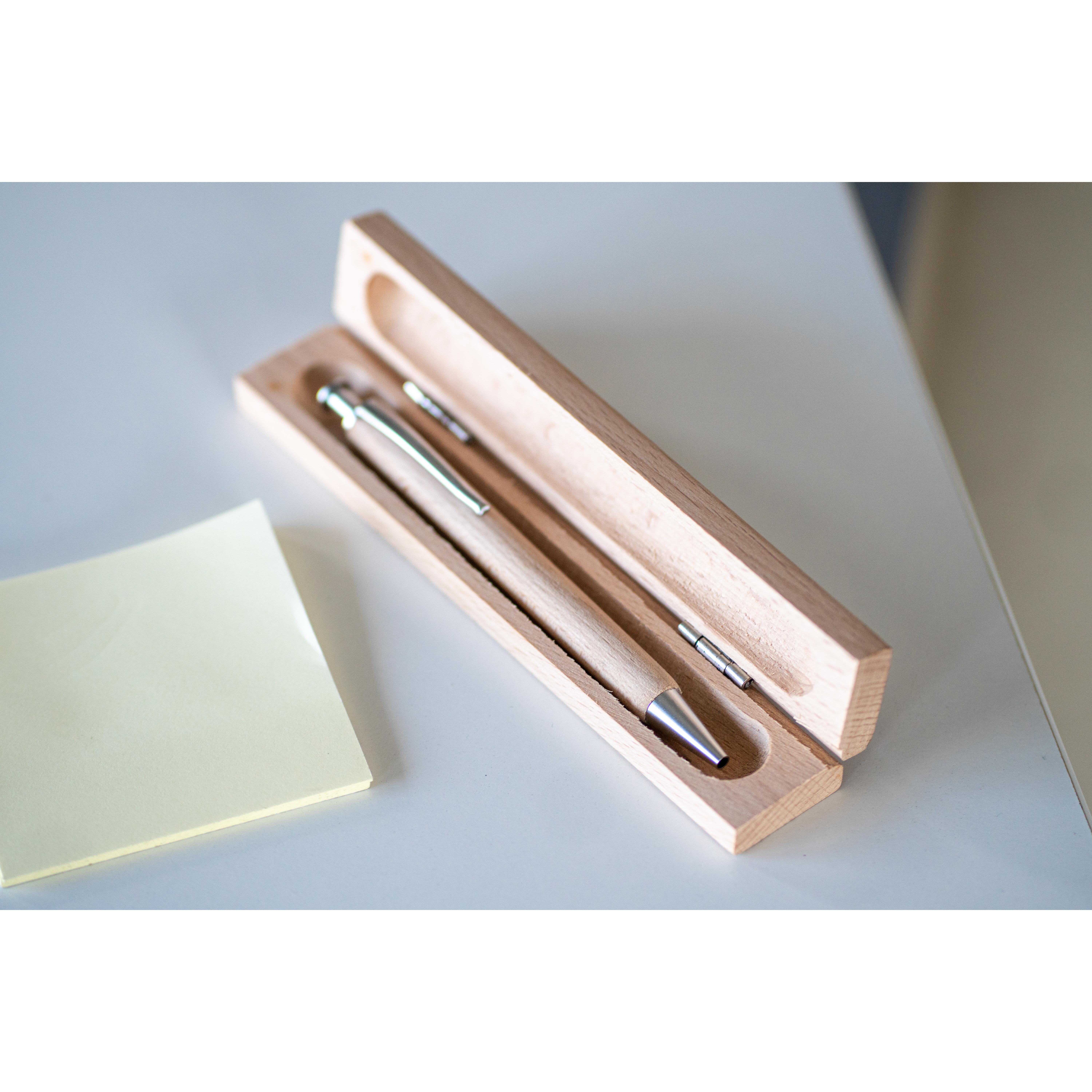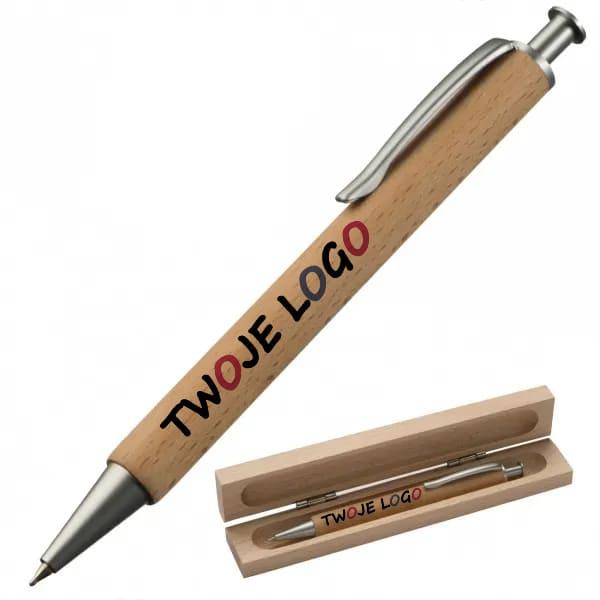 Długopis wykonany z drewna, wyposażony w mechanizm przyciskowy. Długopis posiada wkład piszący na niebiesko. Pakowany w eleganckie drewniane w etui.
