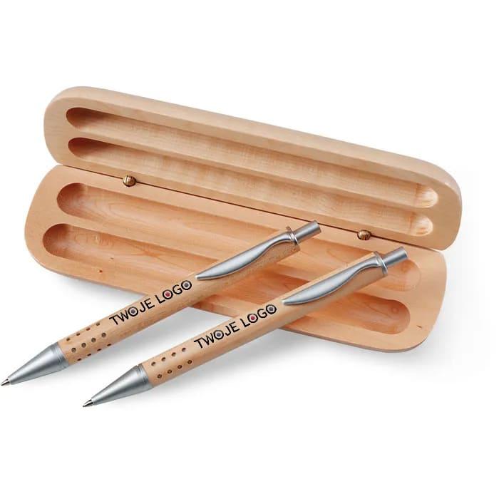 Długopis i ołówek mechaniczny w drewnianym pudełku. Czarny wkład.