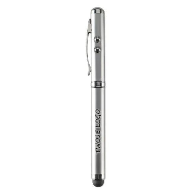 Wielofunkcyjny metalowy długopis: latarka LED (białe światło), wskaźnik laserowy (czerwony) i miękka końcówka. W metalowym pudełku. Czarny wkład. 3 baterie zegarkowe dołączone.