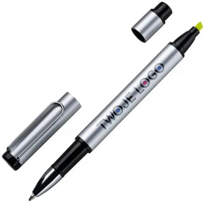 Długopis metalowy 2w1 z żółtym zakreślaczem. Długopis wykonany z aluminium, posiada metalowy klips. Dostępny w szarej kolorystyce z czarnymi elementami.