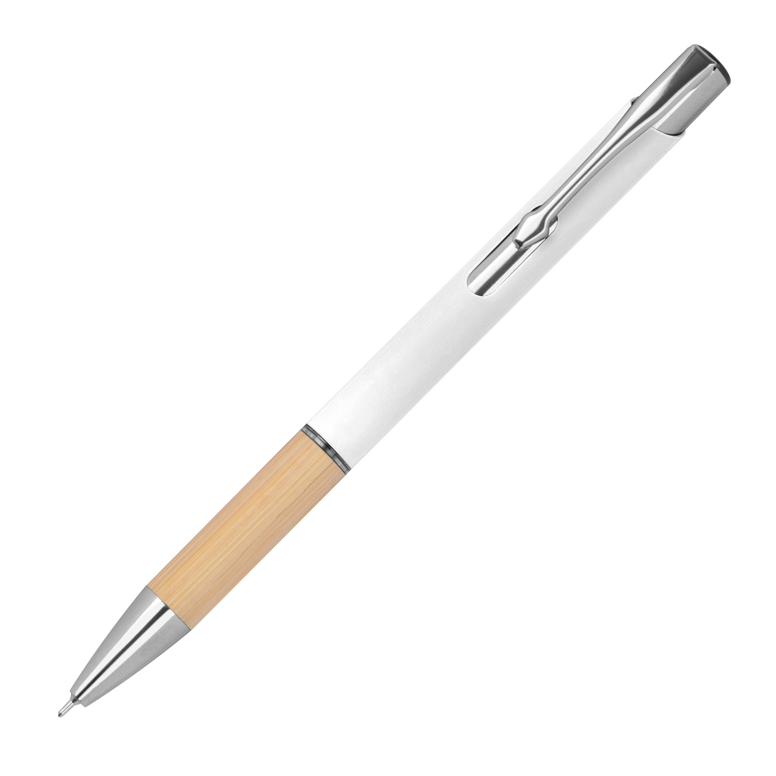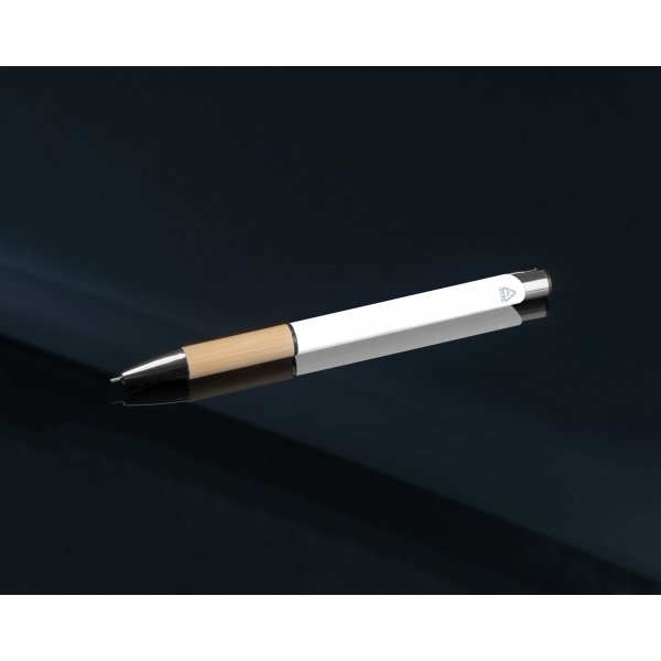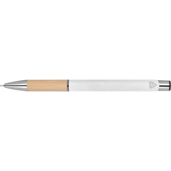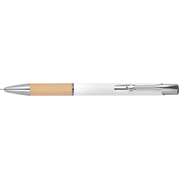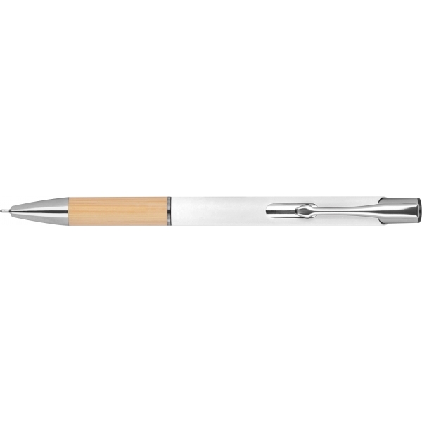 Piszący na niebiesko, półżelowy długopis wykonany z aluminium pochodzącego z recyklingu ze srebrnymi elementami i bambusową strefą uchwytu.