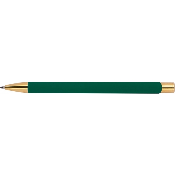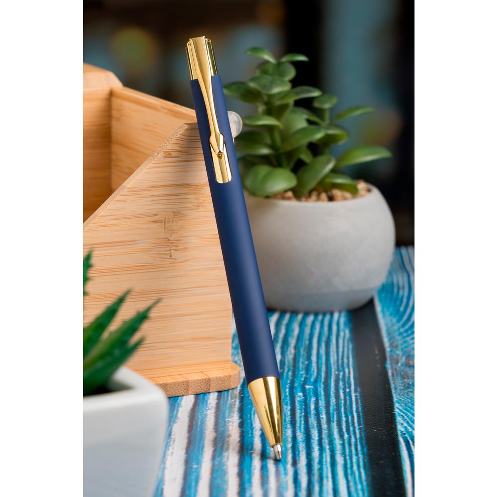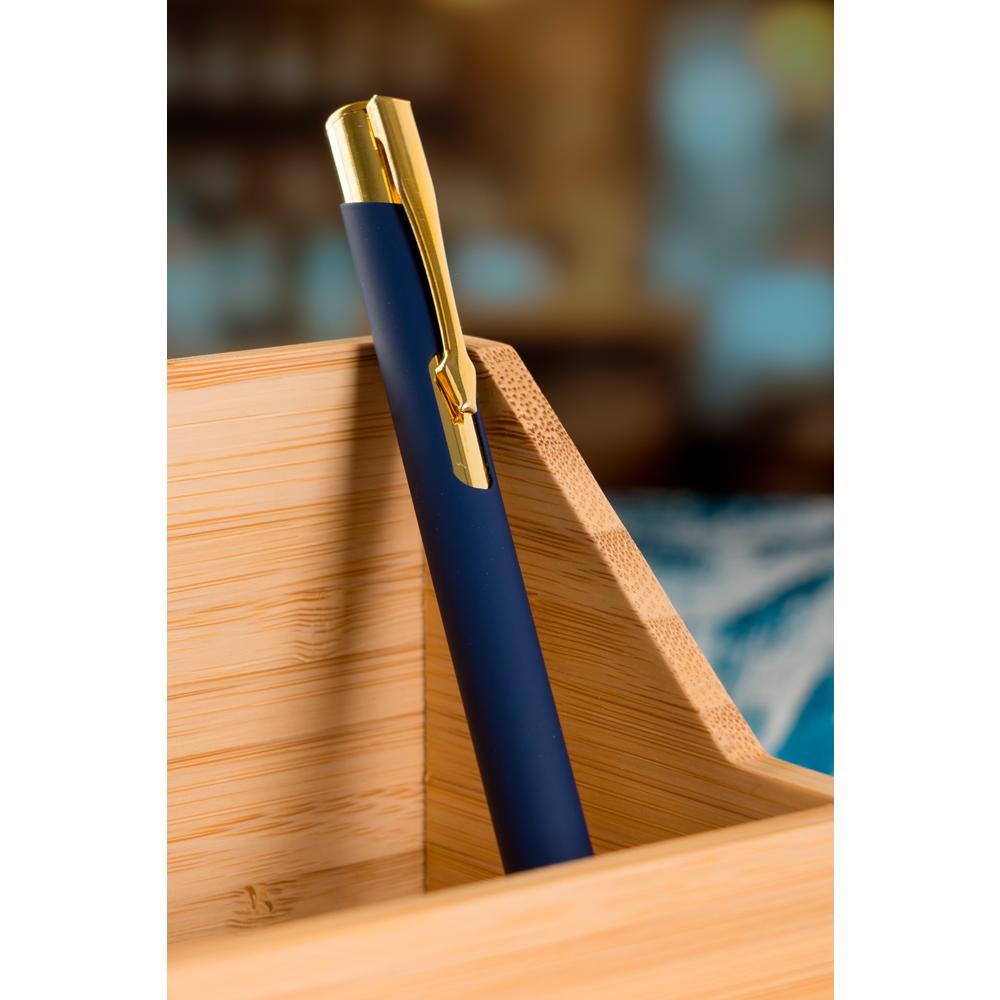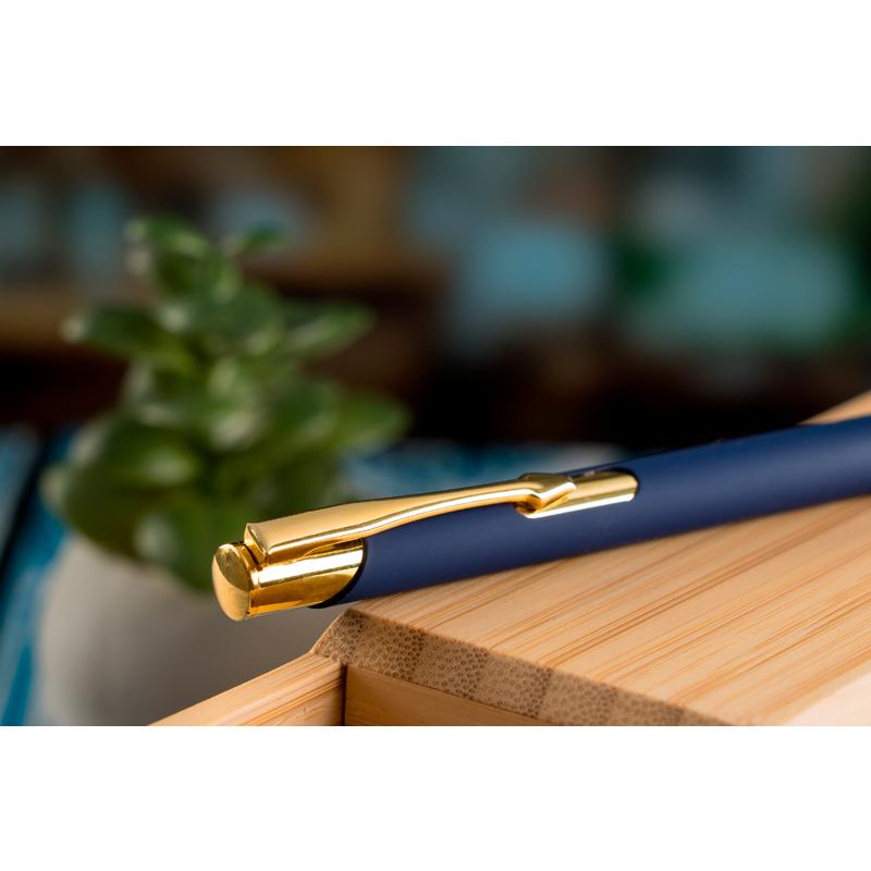 Długopis metalowy soft touch ze złotymi elementami i wkładem piszącym na niebiesko.