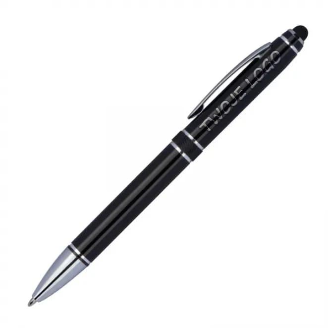 Czarny, metalowy długopis ze srebrnymi elementami, niebieskim wkładem i końcówką touch pen do obsługi ekranów dotykowych.